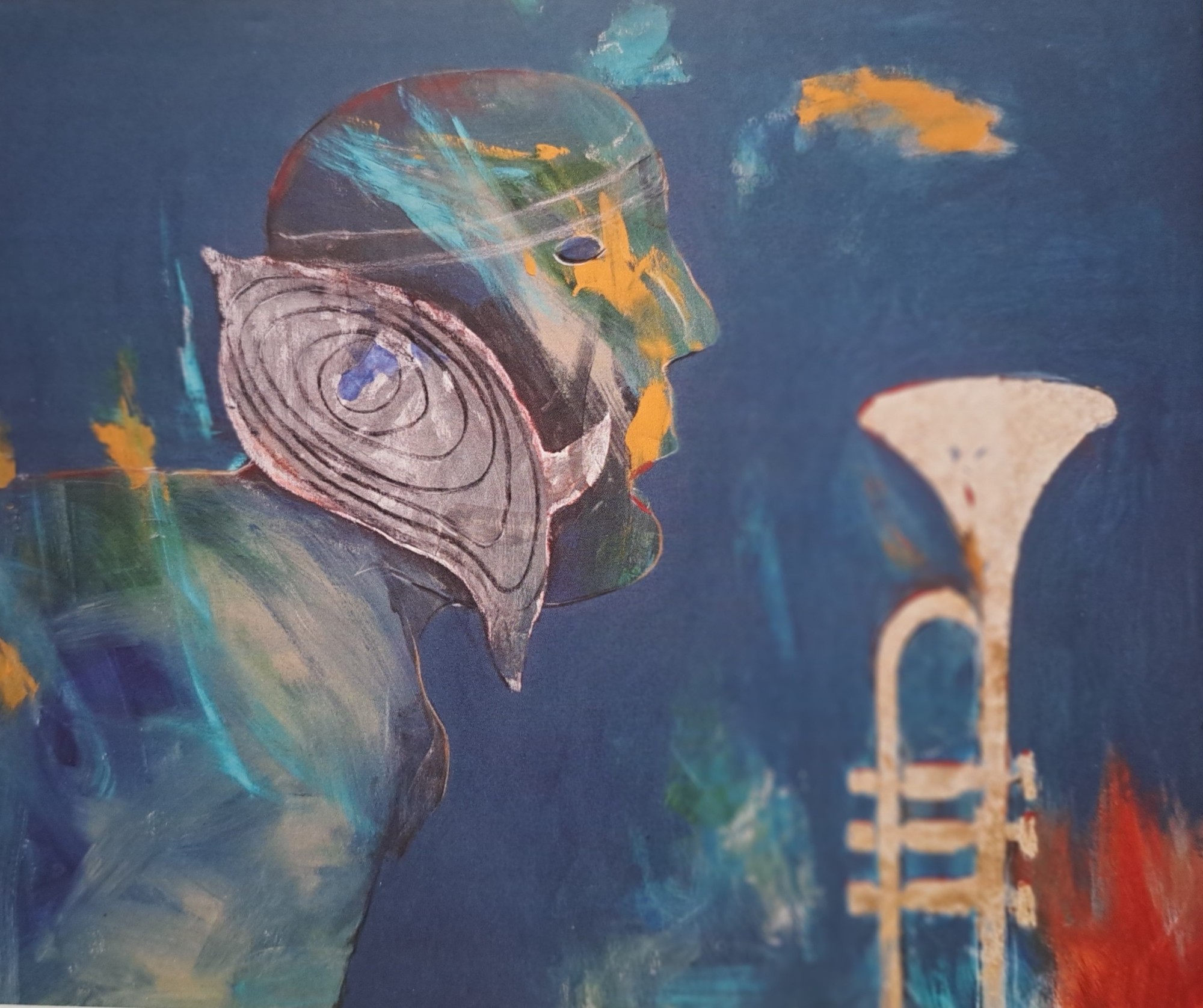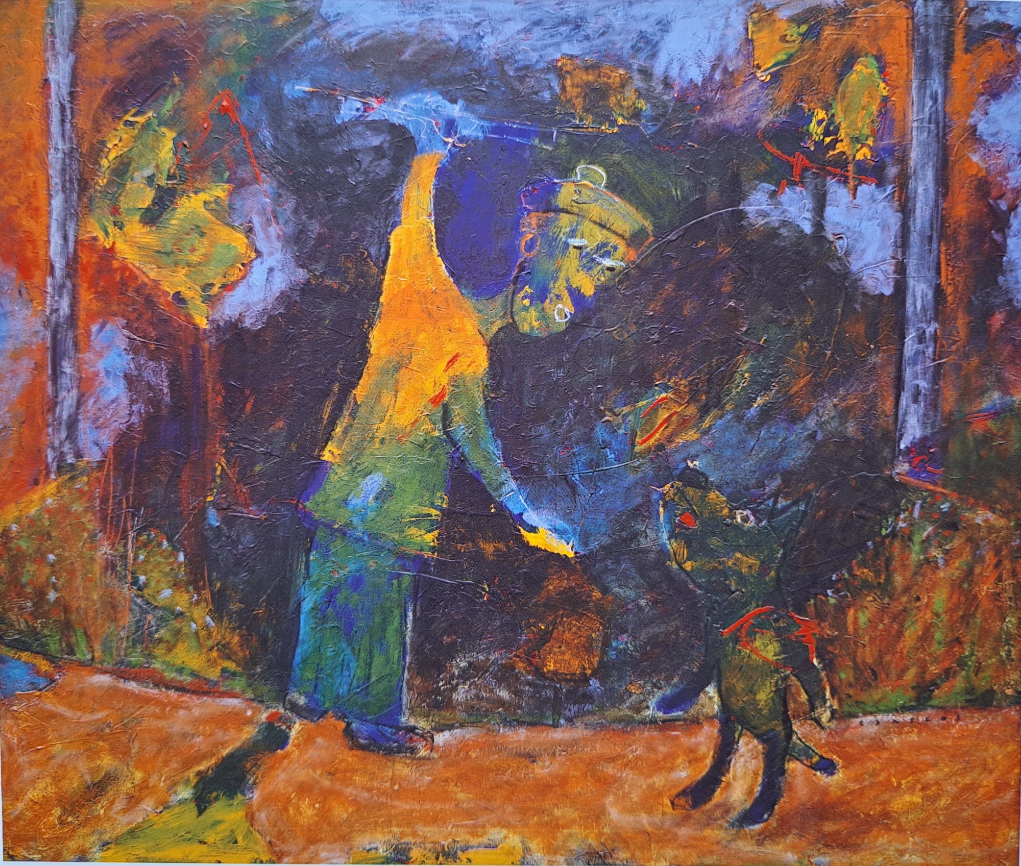 „A zöld, a kék, a türkiz és az indigó teljes harmóniában áll össze” ezen a tárlaton. Olyan megkapó esetlenségben, ahogy csak a gyermekrajzokon jelentkezhet. Méretben és formában is változatosan, a 2 méteres festménytől a 10,5 centis nagyságrendűig. Szimbolikus lények és tárgyak, emberek és állatok, mesehősök és legendás alakok, honiak és egzotikus tájak képviselői, földhöz ragadtak és csodatevők zsongását véli látni, hallani, érzékelni a néző, ha hajlandó vagy képes beleélni magát ebbe a tarka, a maga módján olykor abszurd, békés világba, amelyről már a művek címe is sok mindent elárul. Íme néhány mutatóba: A szarvas és a méhecskék, Játék a farkassal, Zene az Egeknek, A matróz és a három grácia, A görög, Partra szállás, Égi ablak, Japán pár, Angyal pirosban. Valahol végül úgyis felcsendül a szemlélőkben a szférák zenéje, és úgy érezhetik, szótlanul meghúzódva a művészetek emelkedett terében, rájuk figyel az őrangyaluk is.
