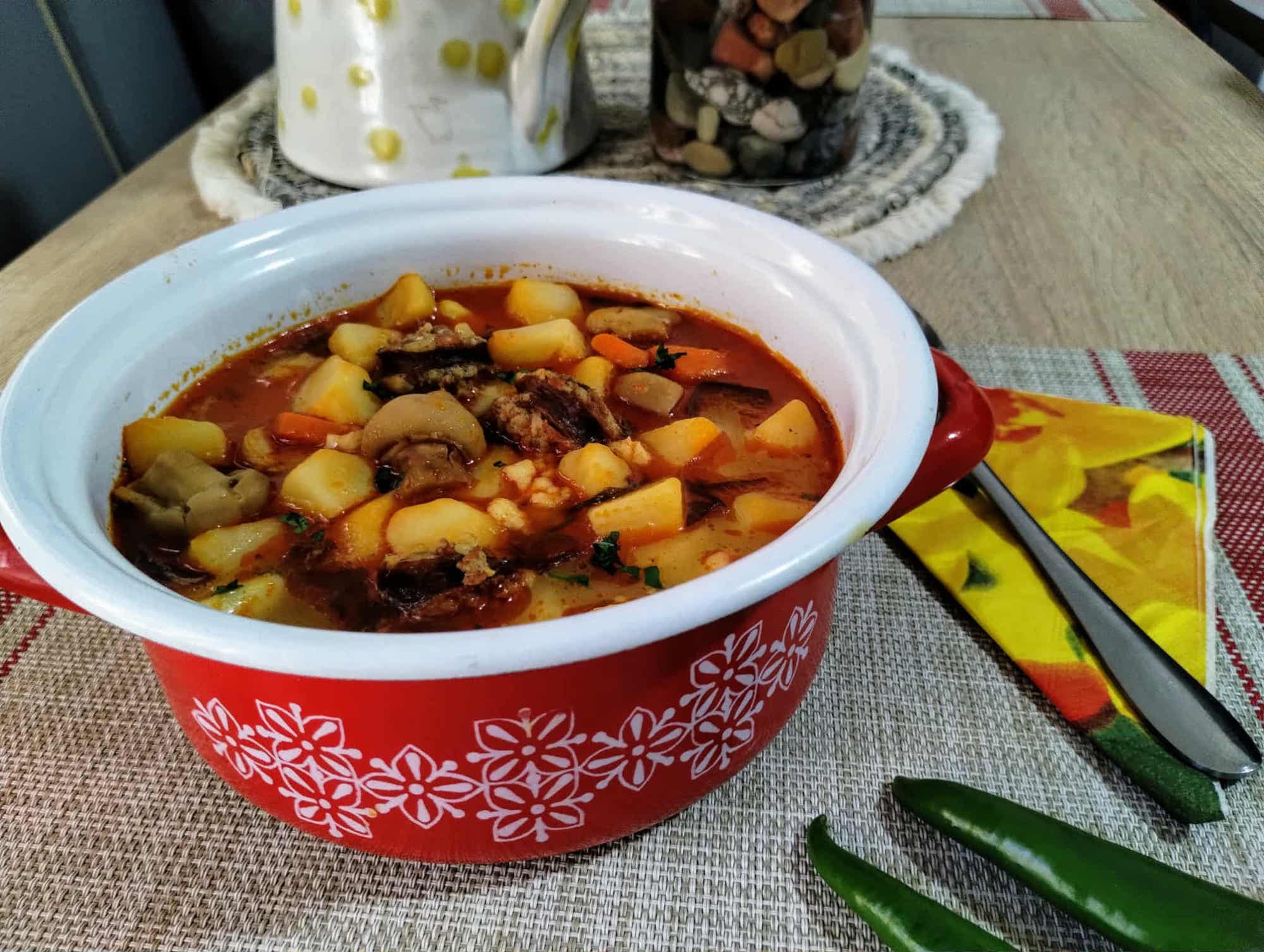 Egy fej hagymát, két nagyobb murkot feldarabolva, egy csokor zellerzölddel, két babérlevéllel, tetszés szerint kolbászt felkarikázva, öt-hat darab csiperkegombát felszeletelve (a kisebbeket egészben hagyom; ha nincs friss gomba, kis üveg gombakonzervet is használhatunk) három liter vízbe főni teszek. Pár szemes borsot, ízlés szerint sót, kávéskanálnyi vegetát is adok hozzá, majd 15 perc múlva a felkockázott krumplit is (kb. fél kilót). Puhára főzöm. Vékony paprikás rántást készítek (olaj+liszt+pirospaprika), hagyom egy picit rotyogni, majd a legvégén egy dl tejszínt is adok hozzá. Zellerzöldet apróra vágok, és a levesre szórom. Csipetkét is szaggatok bele.