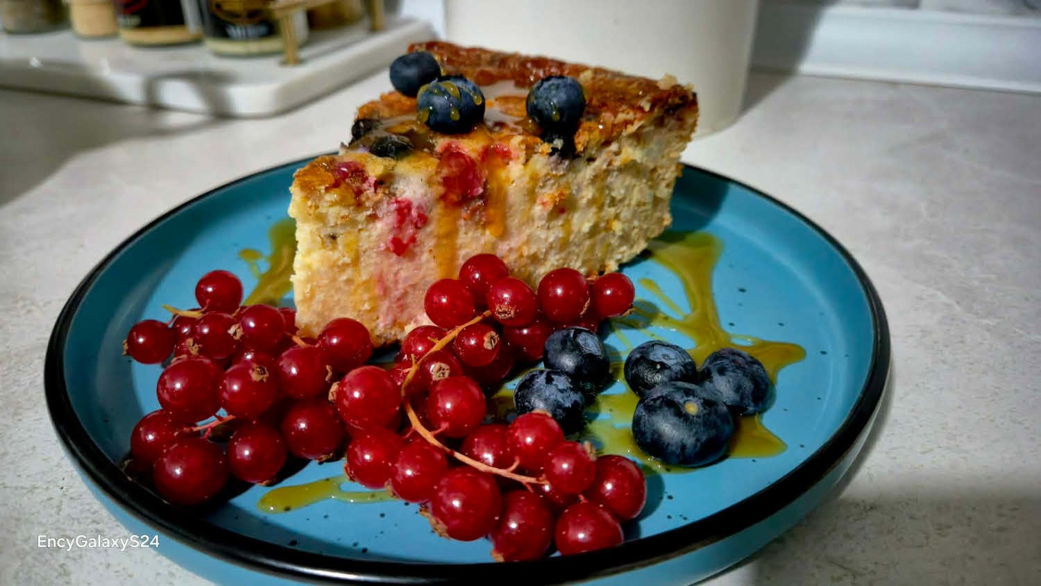 20 dkg rizst először négy dl vízben megfőzök, majd hozzáadok három dl kókusztejet és két dl tejet. Hagyom, hogy kicsit hűljön, majd beleütök hat tojást, hozzáadok 12 dkg vaníliás porcukrot és 10 dkg olvasztott vajat. Belekeverek hat dkg zabpelyhet, egy kevés útifűmaghéjat, és simára keverem egy csomag (kb. 40 g) vaníliás pudingporral. A masszát kivajazott tepsibe öntöm, megszórom  két evőkanál  darált dióval, meglocsolom két evőkanál juharsziruppal, a tetejére szórok 10 dkg áfonyát és 10 dkg ribizlit. Előmelegített sütőben 180 fokon kb. 35–40 percig sütöm, amíg a teteje szépen megpirul. Kicsit hűlni hagyom, majd tálalom. Pudinggal, fagylalttal, karamellöntettel kínáljuk.