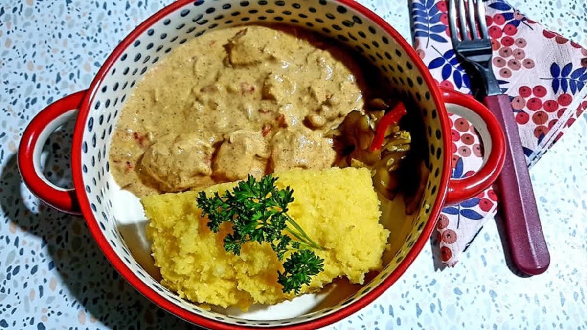 Egy nagyobb hagymát felaprítok, hozzáadok egy kisebb friss paprikát, kevés olajon megdinsztelem a hagymát, és ráteszem a paprikát. Beleteszem a csirkemellet, falatnyi darabokra vágva. Sózom, borsozom. Megvárom, míg kifehéredik, majd hozzáadom a felszeletelt barna csiperkegombát. Együtt párolom a hússal. Amikor minden megpuhul, felöntöm növényi tejszínnel, és főzöm, amíg besűrűsödik. Nagyon krémes lesz. Megkóstolom, ha kell még egy csipet só vagy bors, kevés fokhagyma-granulátum, akkor még ízlés szerint adok hozzá. Puliszkával az igazi!