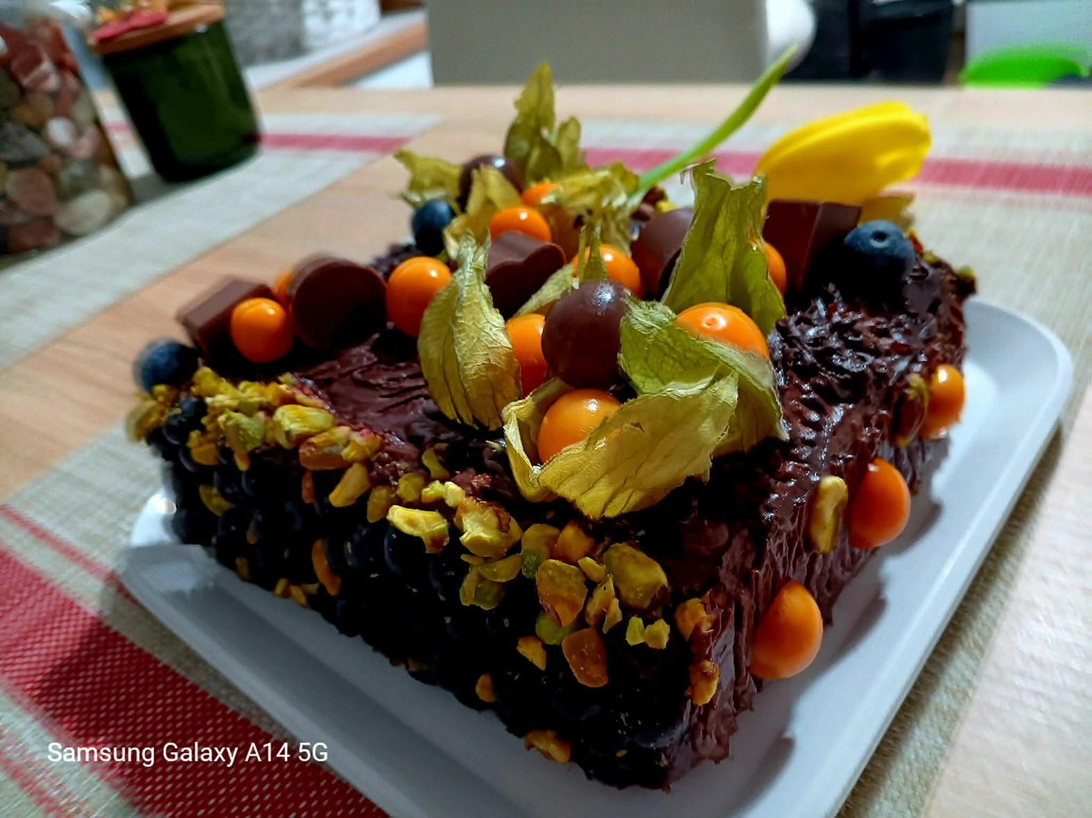 Amikor kihűlt, készítek egy gyors ganache-t: kb. 100 ml tejszínt felmelegítek, beleolvasztok 100 g étcsokit, és ráöntöm a tetejére, hagyom, hogy szépen elterüljön. A végén physalisszal díszítem: a kis leveleit szétnyitom, mint apró lámpásokat, és ráültetem a torta tetejére.