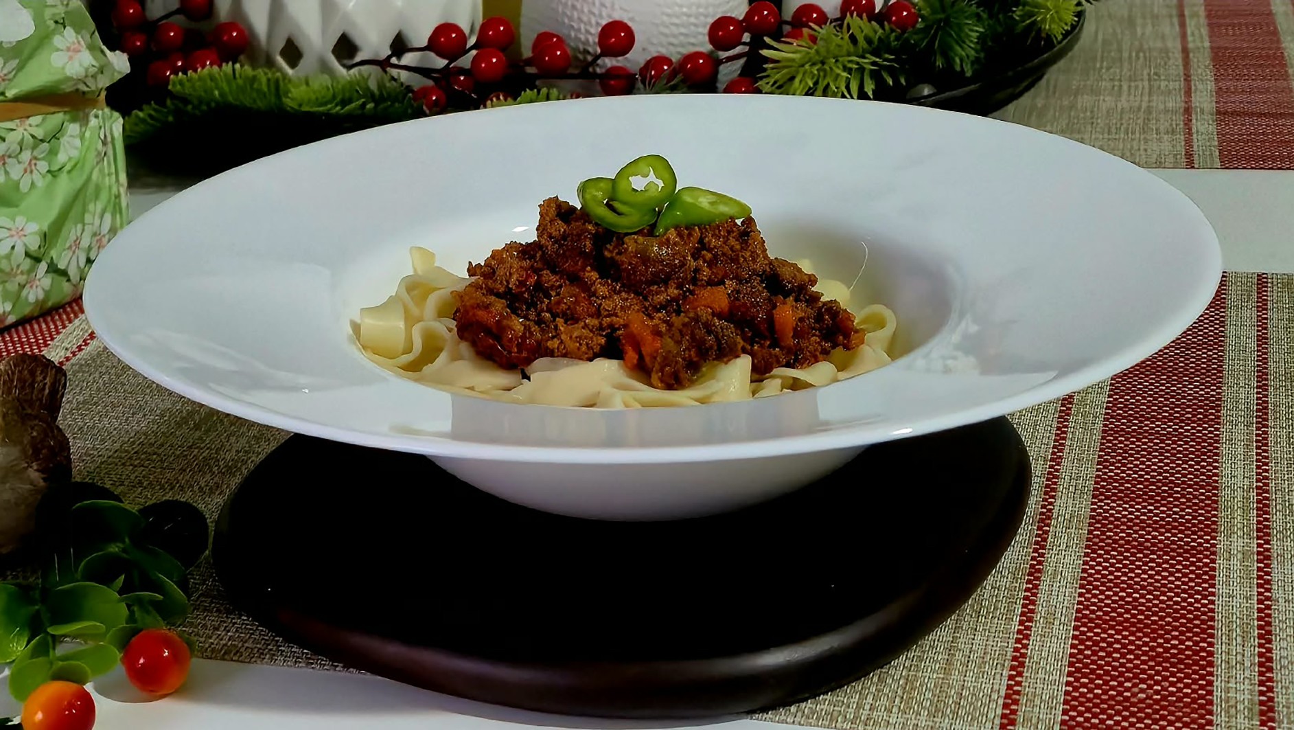 Közben apróra vágok egy nagy fej vöröshagymát és 3 gerezd fokhagymát, ezt a húshoz adom, és együtt dinsztelem pár percig. Rászórok egy teáskanál füstölt pirospaprikát, fél teáskanál őrölt köményt, egy csipet fahéjat és egy kevés kakukkfüvet. Beleteszek két közepes sárgarépát karikákra vágva, egy kisebb zellert kockázva, és egy piros kaliforniai paprikát csíkokra vágva. Kicsit együtt pirítom az egészet, hogy az ízek összeérjenek. Felöntöm kb. 2 dl száraz vörösborral, hagyom, hogy egy kicsit elfőjön az alkohol, majd hozzáadok 2 dl húslevest vagy vizet. Teszek bele egy evőkanál paradicsompürét is. Lefedve, kis lángon főzöm kb. 40–50 percig, amíg a hús puha lesz és a szaft besűrűsödik. A végén megkóstolom, ha kell, még megsózom, borsozom. Közben kifőzök kb. 40 dkg széles metéltet sós vízben, majd leszűröm, egy kevés vajon átforgatom. A végén a ragut ráhalmozom a tésztára, és ha van otthon, megszórom egy kevés friss petrezselyemmel vagy reszelt parmezánnal. Legutóbb pár karika friss csípős paprikával tálaltam.