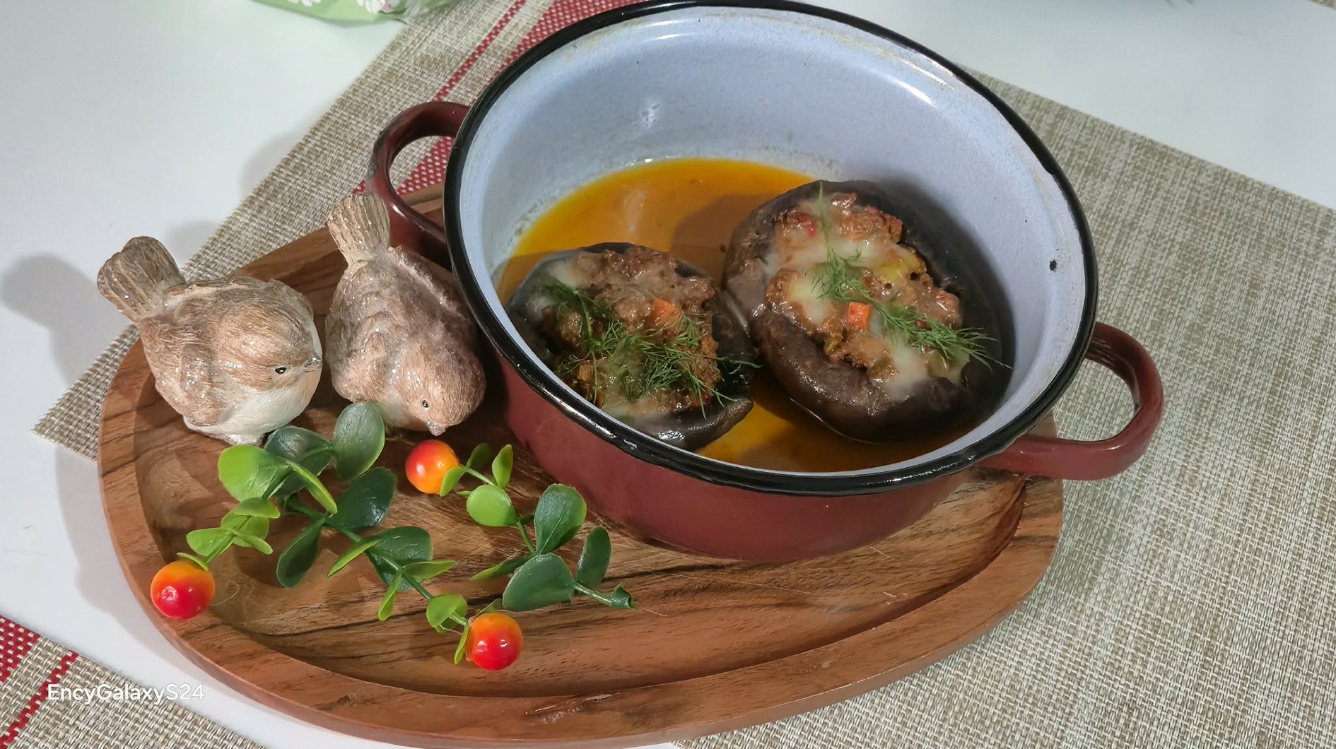 Közben a gombafejeket egy tepsibe teszem, picit megsózom őket, és mindenikbe teszek egy kis vajat (összesen kb. 5 dkg vajat elosztva). Előmelegített 180 fokos sütőben 10 percig elősütöm, hogy kiengedjék a levüket. Utána megtöltöm őket a húsos raguval jó púposan. A tetejükre kb. 20 dkg mozzarellát tépkedek. Visszateszem a sütőbe 180 fokra, és addig sütöm, amíg a sajt ráolvad és szépen megpirul, a gomba pedig teljesen megpuhul. Tetejüket friss kaporral díszítem.