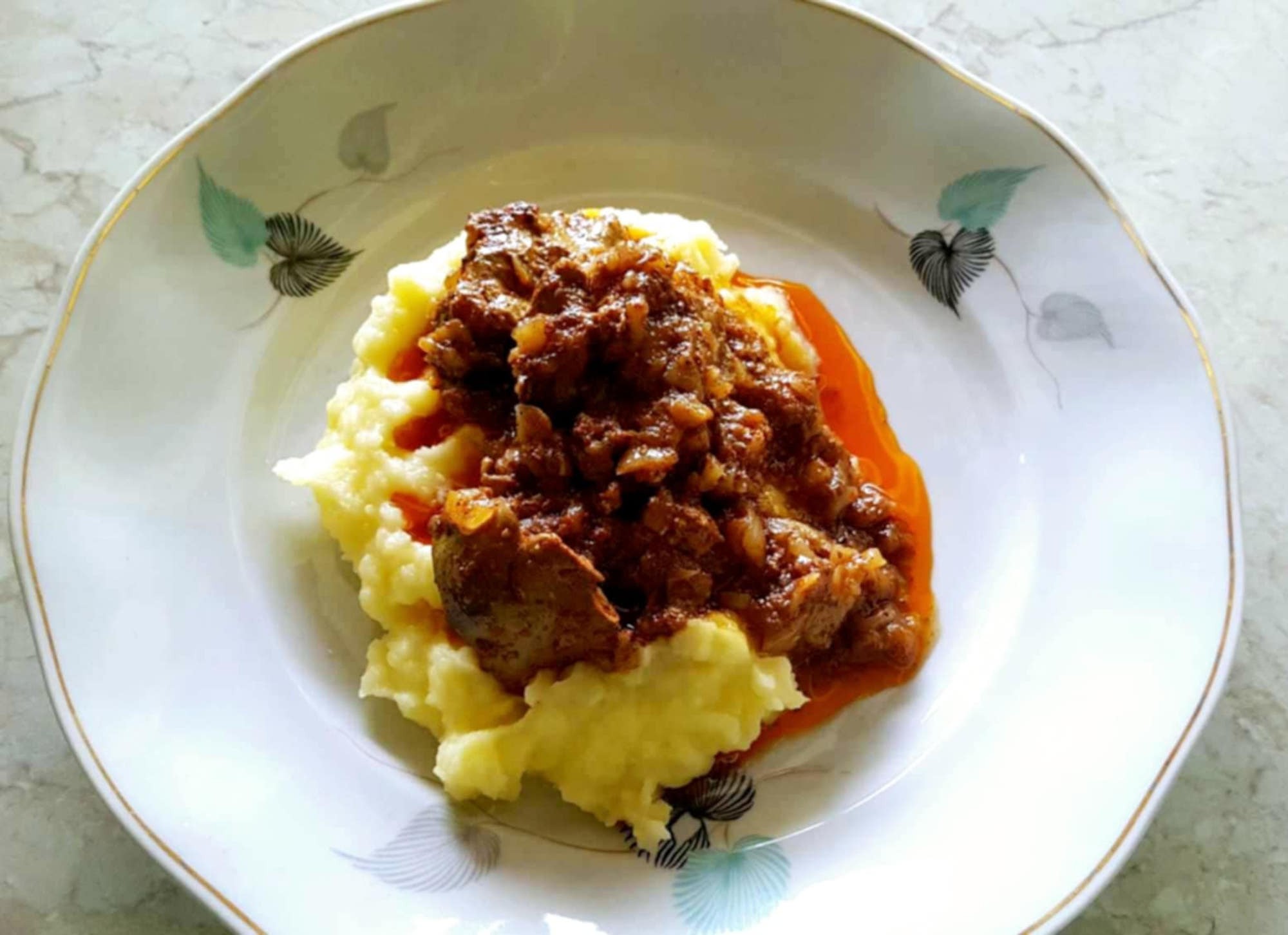 Négy nagy fej hagymát apróra vágok, olajon fél dl száraz vörösborral, sóval, borssal, egy kávéskanál fűszerpaprikával kb. 10 percig, kis lángon, lefedve párolom. A szép sárga házi csirke máját több adag vízzel alaposan átmosom. Négy cikk zúzott fokhagymával összekeverem, és a hagymás masszához adom, fél dl vizet töltök rá, ujjbegynyi cukrot, egy mokkáskanál szárított majorannát (ha van friss, egy jókora szálat, levelével együtt), pár szem aszalt vörös áfonyát is adok hozzá. Kb. 15 perc alatt elkészül. A végén öt percig fedő nélkül folytonosan, óvatosan kavargatom. Fűszerezhetjük még sóval, darált borssal. Krumplipürével, kovászos uborkával, cékla savanyúsággal a legfinomabb.