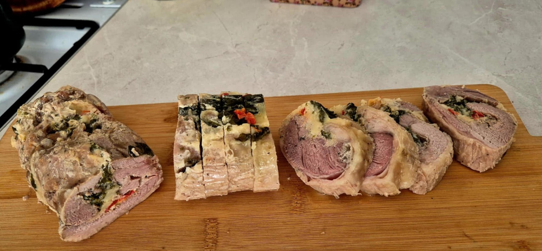 Egy nagy pulykacombot kicsontolok. Szétnyitom, vigyázva arra, hogy a bőrét ne sértsem meg. Az éles késsel többször alaposan ütögetve fellazítom a hús rostjait, és bevagdalom. Megsózom, borsozom, zöldfűszeres sajtkrémmel alaposan bekenem. Kockára vágott piros kápiapaprikával megszórom, vastagon beborítom bébispenóttal. 20 dkg gouda sajtot lereszelek. A spenótot fűszerezem sóval, fokhagymaporral, egy kisebb fej hagymával, amit lereszelek. A spenótra rászórom vastagon a sajtot. A húst felgöngyölöm, bekenem kacsazsírral. Ráhelyezek egy szál rozmaringot. Kevés vörösborral meglocsolom, majd alufóliában szorosan feltekerem, mindkét végét lezárom. Tepsibe helyezem, vizet öntök alája, és 180 fokon 30-35 perc alatt puhára párolom. A fóliát kivágom, és kb. 10 percig így is sütöm. Reggelig hűlni hagyom, majd szeletelem. Bármilyen köret illik hozzá, akár zöldséggel is fogyasztható.