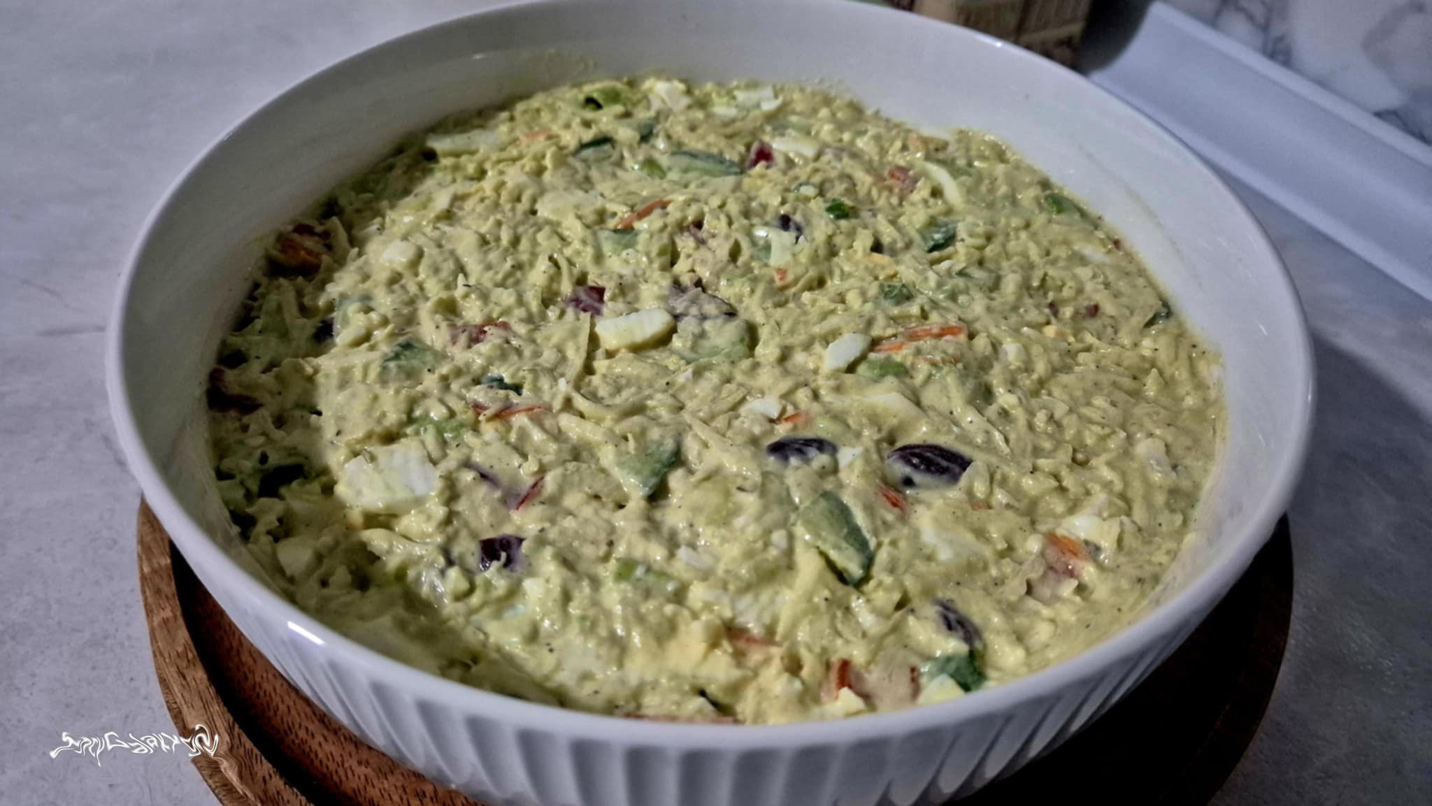 Egy kisebb fej káposztát vékony szeletekre vágok, három kisebb murkot lereszelek, három zöldhagymát karikára vágok. Egy közepes méretű, csont nélküli, főtt csirkemellet apró darabokra vágok, egy piros kápiapaprikát, egy paradicsomot, egy kisebb kígyóuborkát apró kockákra, 1/2 fej jégsalátát apróra tördelek, egy kisebb jégcsapretket tetszés szerint feldarabolok, egy érett avokádót szintén. Legvégén három evőkanál főtt vörös babot és öt főtt tojássárgát, szintén felvágva, hozzáadok a salátához. Megsózom, borsozom. Öntet: egy érett avokádót pürésítek, egy kávéskanál ketchupot, egy mokkáskanál mustárt, három evőkanál majonézt, egy evőkanál mézet, egy mokkáskanálnyi lime-levet, egy dl tejfölt, három dl görög joghurtot, kevés zöld kaprot, egy csokor vagdalt friss petrezselyemzöldet, négy cikk zúzott fokhagymát, kevés chiliport, csipetnyi darált gyömbért és pici darált köményt alaposan kikavarok, majd a zöldséges egyveleghez kavarom. Egy órára a hűtőbe teszem. Nagyon laktató, egymagában is fogyasztható.