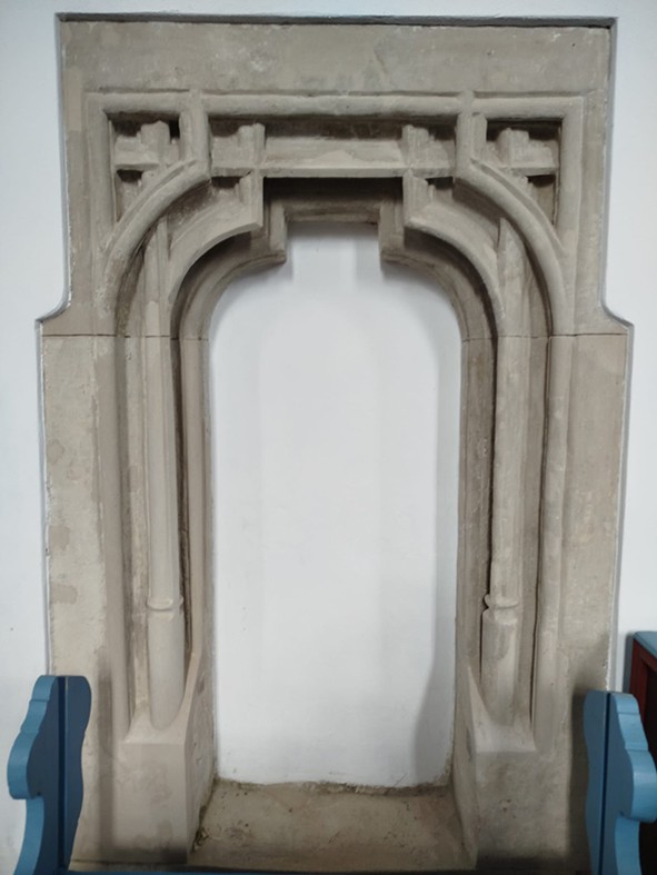 A szentélyben az északi falon a befalazott sekrestyeajtó késő gótikus, szemöldökgyámos, gazdagon tagozott kerete látható.