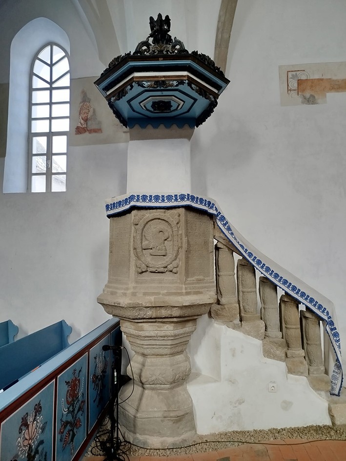 Ugyanitt található egy kőből faragott, kehely alakú szószék is, amely 1710‐ben Donáth György költségén készült. A későbbiekben visszatérünk ismertetésére.