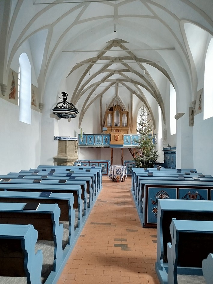 A szentély kőbordás boltozata és az orsós gyámkövek épen megmaradtak