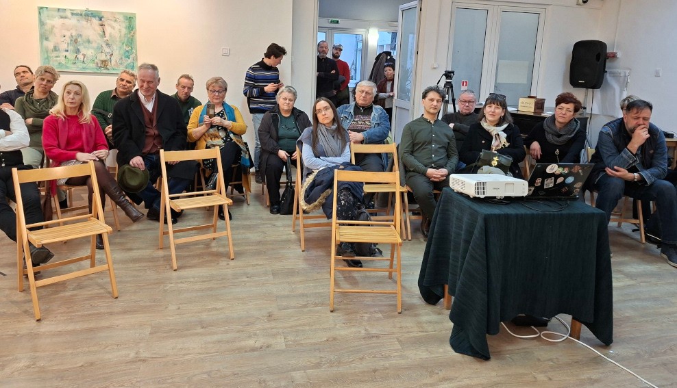 Hírneve megelőzte a Nyárádszentsimoni Művésztelep válogatott anyagát Marosvásárhelyen, ennek is köszönhető, hogy a helyi média képviselői a szokásosnál is nagyobb létszámban várták és szólaltatták meg a kiállító művészeket a Bernády Házban a február 12-i tárlatnyitó előtt és után. Nem lehetett jelen mind a 14 alkotó, aki vendégeskedett és jelt hagyott magáról az immár ötödszörre is összehívott alkotótáborban, de kilencen személyesen is részt vettek az eseményen. Nyilván ott volt a Harangláb Kulturális Egyesület égisze alatt működtetett létesítmény és alkotóközösség házigazdája, Mihály Zsolt és textilműves felesége, Mihály Eszter, Éltes Barna (Feldoboly), a tábor művészeti vezetője, Kolozsvárról a szobrász Gergely Zoltán, Horváth Levente Zsobokról, Ferencz Zoltán Gyergyószárhegyről, Háromszék képviseletében a filmes Vörös T. Balázs, a marosvásárhelyiek közül pedig Makkai István, Veress Gábor Hunor és Csóka Szilárd Zsolt. A többiek – Baab József (Marosvásárhely), Siklódy Ferenc (Csíkszereda), Gagyi Botond (Kolozsvár), Sipos Gaudi Tünde (Sepsiszentgyörgy), Rizmáyer Péter (Árkos) – alkotásaik révén kapcsolódtak a szentsimoni alakulathoz. Korban nem egyazon generáció, bár, ha egyetlen szóval akarnánk meghatározni a társaságot, azt mondhatnánk, hogy ötvenesek. Műfajukat tekintve is többfélék, jól kirajzolódó, markáns művészi karakterek, következetesek saját elképzeléseik, látásmódjuk érvényesítésében, a kortárs művészet megítélésében is, de a nyárádszentsimoni kezdeményezés, az archaikus sajátosságokkal felruházott mikrokörnyezetben szabadon ütköztetett közös gondolkodás és a nem egyszeri közös munka is serkentőleg hat az ott tartózkodókra, szellemi közösséget is képes teremteni. Ebből a bemutatott alkotások mellett érzékletes ízelítőt adott Vörös T. Balázs helyszíni videóprodukciója is. Ebből beszédesen kiviláglott a tábor és a hely hagyományőrzésre és alkotó megújulásra egyaránt ösztönző szelleme. Már a vetítés idején érzékelni lehetett, hogy a Szentsimonhoz közel álló közönség jól ismert jelenséggel találkozhatott újra. A nézők közt színházi emberek is voltak, jelezve, hogy a telep nem csak a vizuális művészetek barátságos tanyája, más művészeti ágak számára is termékeny eszmecserék színhelyéül szolgál.