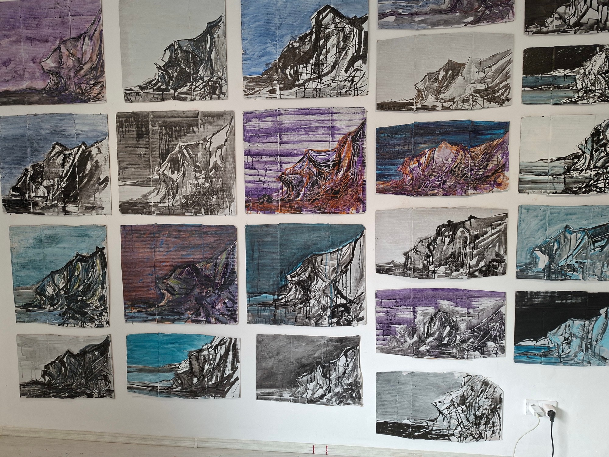 Igen, a tenger hatása is meghatározóvá vált, a nagy kékség, a vadul habzó hullámzás, de mindenekelőtt a geológiai különlegességként is döbbenetes parti sziklák, az óceán fölé magasodó, rétegzett képződmények keltettek benne mély benyomást. Mint szenvedélyes láncdohányzás esetében, úgy követték egymást a vázlatai. Meredeken égbe szöknek rajtuk a markáns sziklasziluettek, lenn csendes, sík kontrasztként simul a víz, a fények, tónusok zaklatott fonalhálózata sok mindent elárul a művész szeszélyesen pulzáló lelkiállapotáról. A művész absztrakt dominanciájú univerzuma magába szervesíti a tájelemeket, és így, együttesen beszédes igazán ez a sorozat, amely újdonság abból a szempontból is Kentelki gyakorlatában, hogy tusrajz, amin a fekete-fehér drámaiságát időnként megszelídíti, hangulatilag árnyalja az enyhe színezés. Csodálkozhattak a part menti baszk boltosok, minek kell az ifjú idegennek annyi csomagolóanyag. Nem tudhatták, hogy a marosvásárhelyi művész tartaléka kifogyott, anyag hiányában a hullámos kartonra volt kénytelen átállni. Az pedig egy sajátos megoldásra, olyan technikára kényszeríti, ami kuriózumként is meglepheti a kiállítás közönségét. Persze ahol tenger, ég és föld összeér, ahol a dús növényzet és homok vetélkedik, ott az is a színek fogságába esik, aki nem festő. De Kentelki az, ismerjük korábbról élénk színekben pompázó, egymással szembesülő, egymást felerősítő, telített koloritjait. Magától értetődő, hogy festészete is magán viseli a baszkföldi hónapok jegyeit. A tárlaton farostlemezen és papíron is megjelennek tájélményei. Sőt két fotót is kiállított, amelyek csalhatatlanul megmutatják, honnan indult, és merre vitte a piktúra nyelvezete. Az azonban, hogy ez a spanyol intermezzo mi újat hoz a kiállító munkásságába, majd a továbbiakban derül ki, amikor már leülepednek az ottani emlékek, és a vázlatokat az elmélyültebb képek váltják fel. Kíváncsian várjuk.