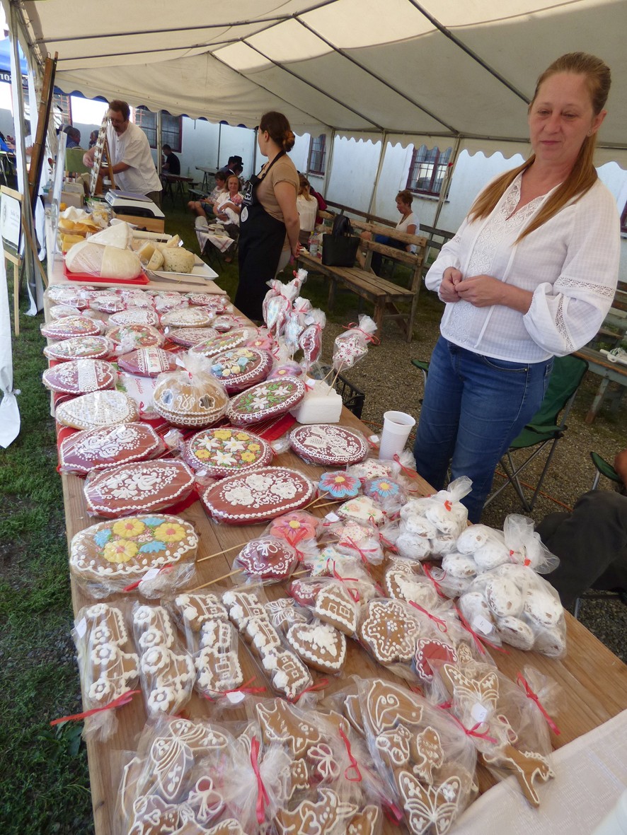 Eközben az iskolaudvaron helyi termékek vásárán és kiállításon lehetett bámészkodni és szatyorba rakni a szemet-szájat ingerlő falatokat. Sóváradi kézműves fagylalt, a kebelei Cseh-tanya szörpjei, lekvárjai és italai, a nagyteremi Györfi Árpád zöldségei, a marosvásárhelyi Gödri-méhészet termékei és a mezőcsávási Sunrise Garden bogyós gyülmölcsökből készült lekvárjai, szörpjei, az iklandi Gyarmati Mátyás fekete ribizliből, almából, céklából, murokból préselt levei vagy épp pálinkái éppolyan ínycsiklandóak, mint a mezőpaniti Kovács Kinga és Nagy Erna által kínált házi kenyér és friss káposzta, a nyárádszentmártoni Szőke Tímea sajtkülönlegességei, a búzaházi Nagy Erzsébet mézespogácsái vagy a székelyvajai Pécsi-kürtőskalácsok. A kínálatot a mezőkölpényi szőlészet zárta szőlővel és borral, de nem mehettünk el megállás nélkül a marosvásárhelyi Péterfi Márta ékszerei, a székelyudvarhelyi Kilyén Irma festett tárgyai, bútordarabjai és Kilyén József fa ékszerei mellett sem. A sorban két, mezőgazdasági gépeket és tarktort, illetve egy műtrágyát és mezőgazdasági segédeszközöket bemutató céget is találtunk, míg a cirokprogramban részt vevő gazdák, a marosszentgyörgyi Nagy Barna, a küküllőszéplaki Veres József, a balavásári Miklós Gyula tanácsokat adtak az érdeklődőknek.