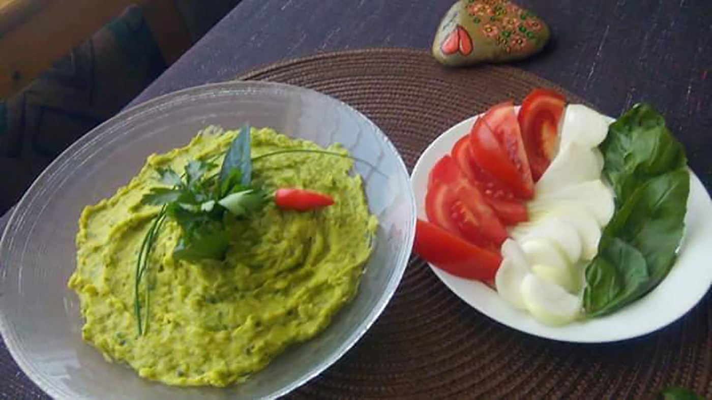Az 50 dkg mirelit (fagyasztott) zöldborsót sós vízben megfőzzük, majd leszűrjük. Egy kisebb fej hagymát apróra vágunk, 2 gerezd fokhagymát, 10 dkg lágy vajat, kevés krémsajtot,1 kávéskanál olívaolajat, ízlés szerint sót, darált borst és pár mentalevelet a zöldborsóval együtt kidolgozunk. Két főtt tojássárgát kockára vágunk, és ezzel dúsítjuk a finom krémünket. Pirítósra kenve tálaljuk, paradicsomot, hagymát, spenótlevelet tehetünk rá.