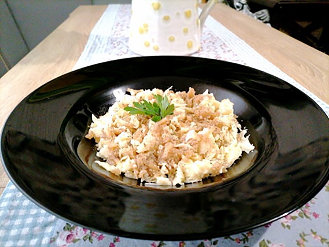 Egy tömött fej káposztát finomra vagdalunk. Sóval alaposan meggyúrjuk, majd kevés olajon, folytonos kevergetés mellett megpároljuk a káposztát. Kb. 25 perc alatt készen van. Legvégén kevés cukorral, jó sok őrölt fekete borssal fűszerezzük. A laskát sós vízben kifőzzük – egy kiskanál olajat mindig teszünk a vízbe –, majd leszűrjük. A káposztával összekeverjük és máris tálalhatjuk.