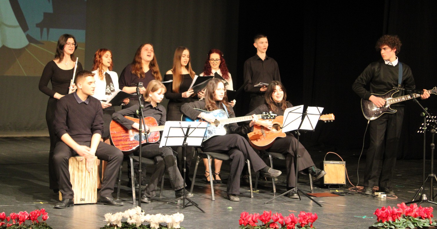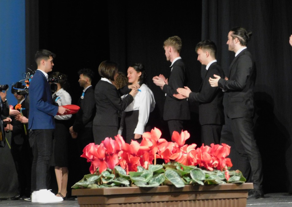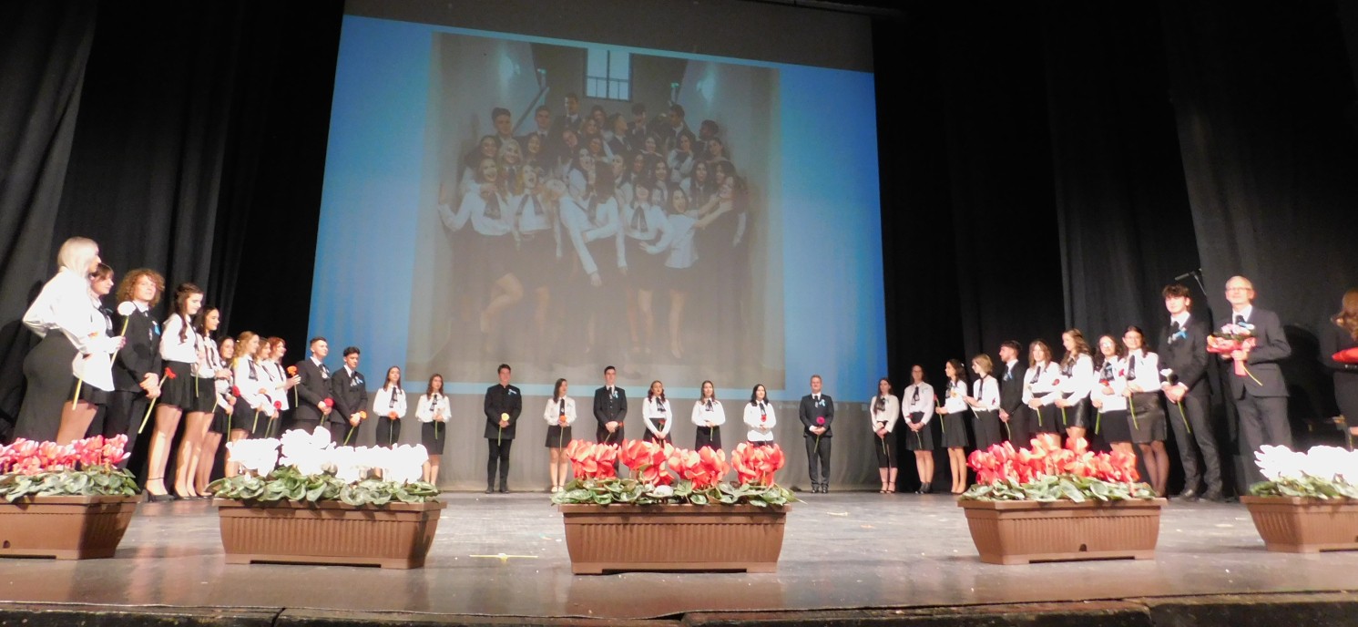 Kisfilmjük vetítése után Szente Tünde tanárnő vezetésével sorakozott fel a színpadon a XII. D társadalomtudományok – intenzív német–olasz szakos osztály 25 diákja.