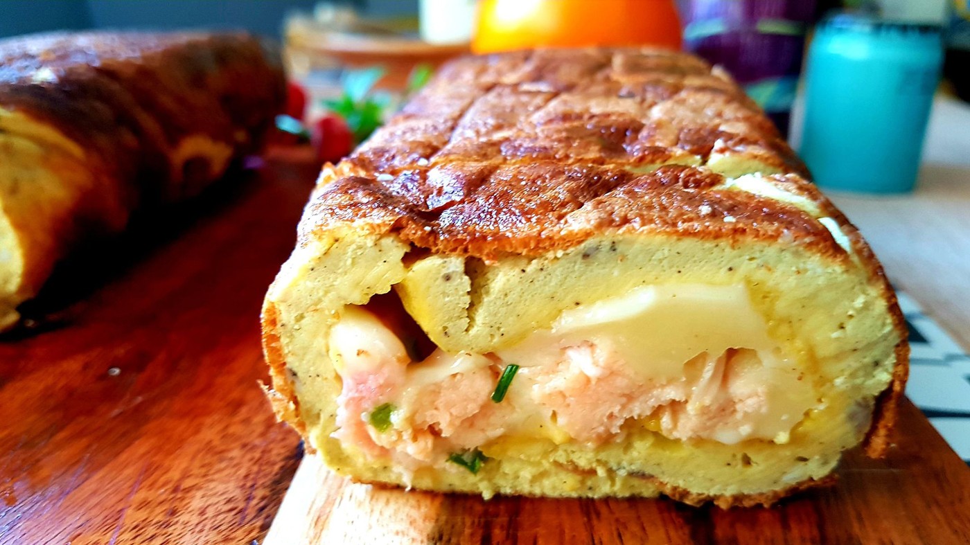 A húst a tojáslepény előtt készítsük el. A tojáslepényen elhelyezzük a húst és 10 dkg reszelt sajtot. Aki kedveli, kockára vágott piros kaliforniai paprikát, snidlinget, hagymát, kockára vágott kovászos uborkát, csemegekukoricát is tehet rá. Mindezek után szorosan alufóliába felcsavarjuk, a két végét összetekerjük. Méretes szaloncukorformát kapunk, majd hűtőbe tesszük 1 órára, ezt követően szeletelhető. Savanyúsággal, zöldségekkel, szószokkal fogyasztjuk.