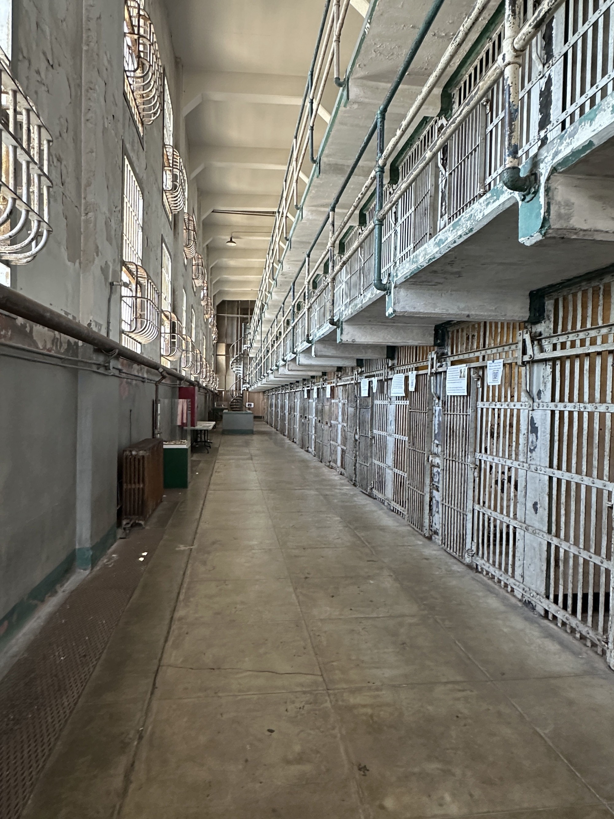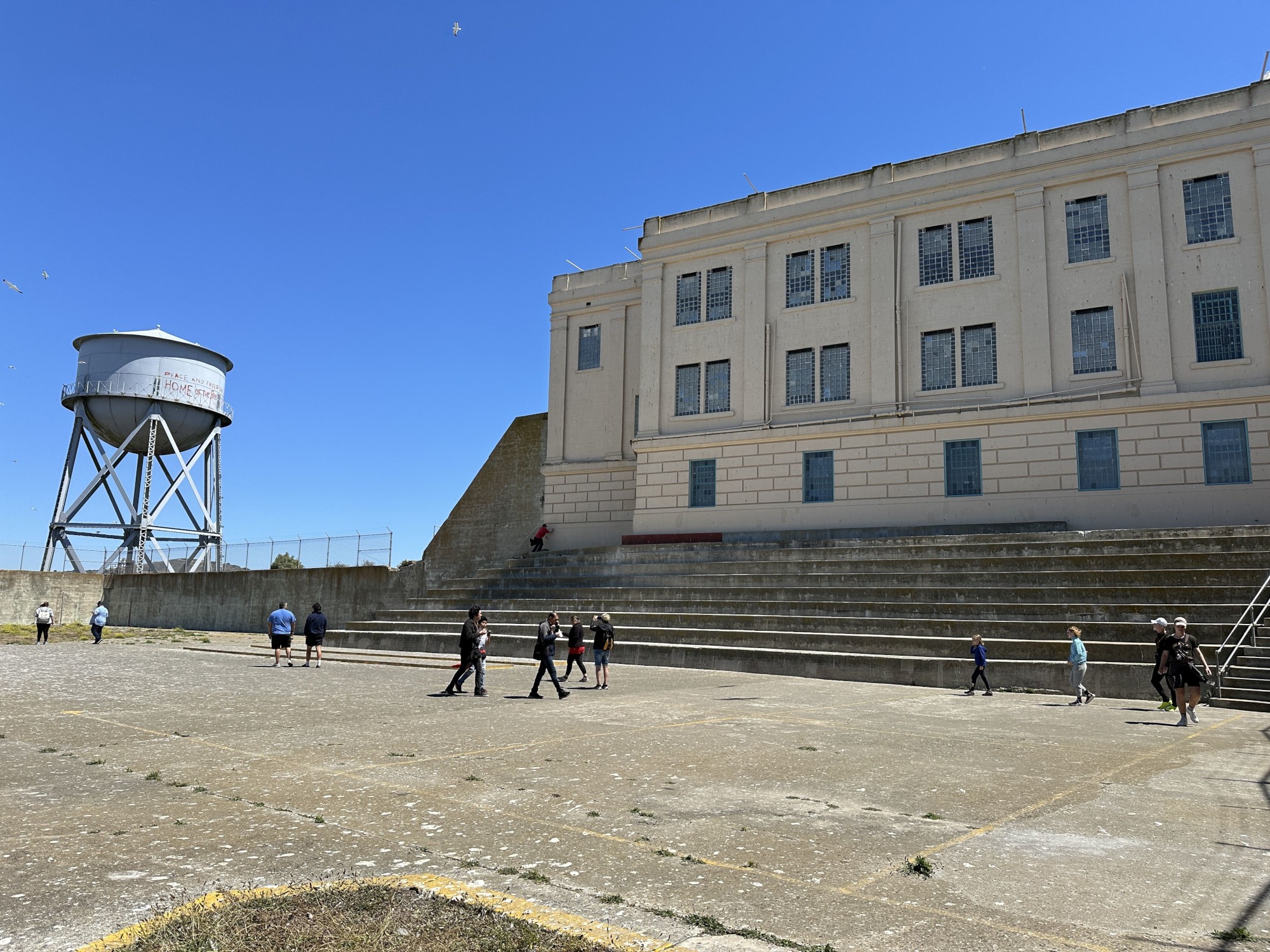 A börtön meglátogatása számunkra azért is volt érdekes, mert korábban több dokumentumfilmet néztünk meg a hírhedt intézménnyel kapcsolatban, és láttuk a Clint Eastwood főszereplésével készült Szökés az Alcatrazból című idegborzoló mozifilmet is, amely az 1962-es furfangos fogolyszökés történetét tárja fel eastwoodosan. A börtön „hőskora” az 1930-as és ’60-as évek közötti időszakra esik, amikor a szuperbiztonságosnak ítélt falak között „nehézsúlyú” fegyencek töltötték büntetésüket, mert előbb-utóbb a gengsztervilág olyan legendái, mint Al Capone is horogra akadtak az állhatatos amerikai igazságszolgáltatás nagyüzemében, és az Alcatrazban „vendégeskedtek”. Láttuk a börtön sétálóját, amely nagyon emlékeztetett a börtönben játszódó amerikai filmek rekreációs udvarára. Úgy éreztem magam, mintha a korábban említett film vagy A remény rabjai című emlékezetes film forgatási helyszínére csöppentem volna, és Tim Robbinsszal, Morgan Freemannel együtt álmodoznék a szabadulásról. Bejártuk a börtön blokkjait, benéztünk a spártai cellákba, azokba a híresekbe is, amelyekből a kanállal kivájt réseken keresztül sikerült megszökniük a leleményes raboknak, miután kezdetleges eszközökkel élethűre eszkábált próbababafejet hagytak az őrök megtévesztésére a takaró alatt. Az egykori börtönélet megannyi érdekességét nézhettük meg, a zuhanyzóktól a hullaházon át az adminisztrációs épületig, de azt talán kevesen tudják, hogy a börtön bezárása után, a ’60-as években különböző törzsekhez tartozó indiánok elfoglalták, kisajátították a szigetet, és különféle jogokat, intézmények létesítését követelték. Ennek az okkupációnak láthattuk az emlékeit, ilyesfajta feliratok voltak piros festékkel felfestve a falra, illetve a víztoronyra: „Üdvözöljük az indiánokat! Indián föld. Egyesült indián tulajdon. Üdvözöljük a békét és a szabadságot! A szabad indián föld otthona.” A foglalás másfél éves időszaka végül kudarcba fulladt, a hely drogtanyává züllött, és még egy tűz is kiütött, aminek a nyomai ma is látszanak. A mozgalom nem érte el eredeti céljait, mégis mérföldkőként tartják számon az amerikai indiánok jogaiért folytatott küzdelemben.