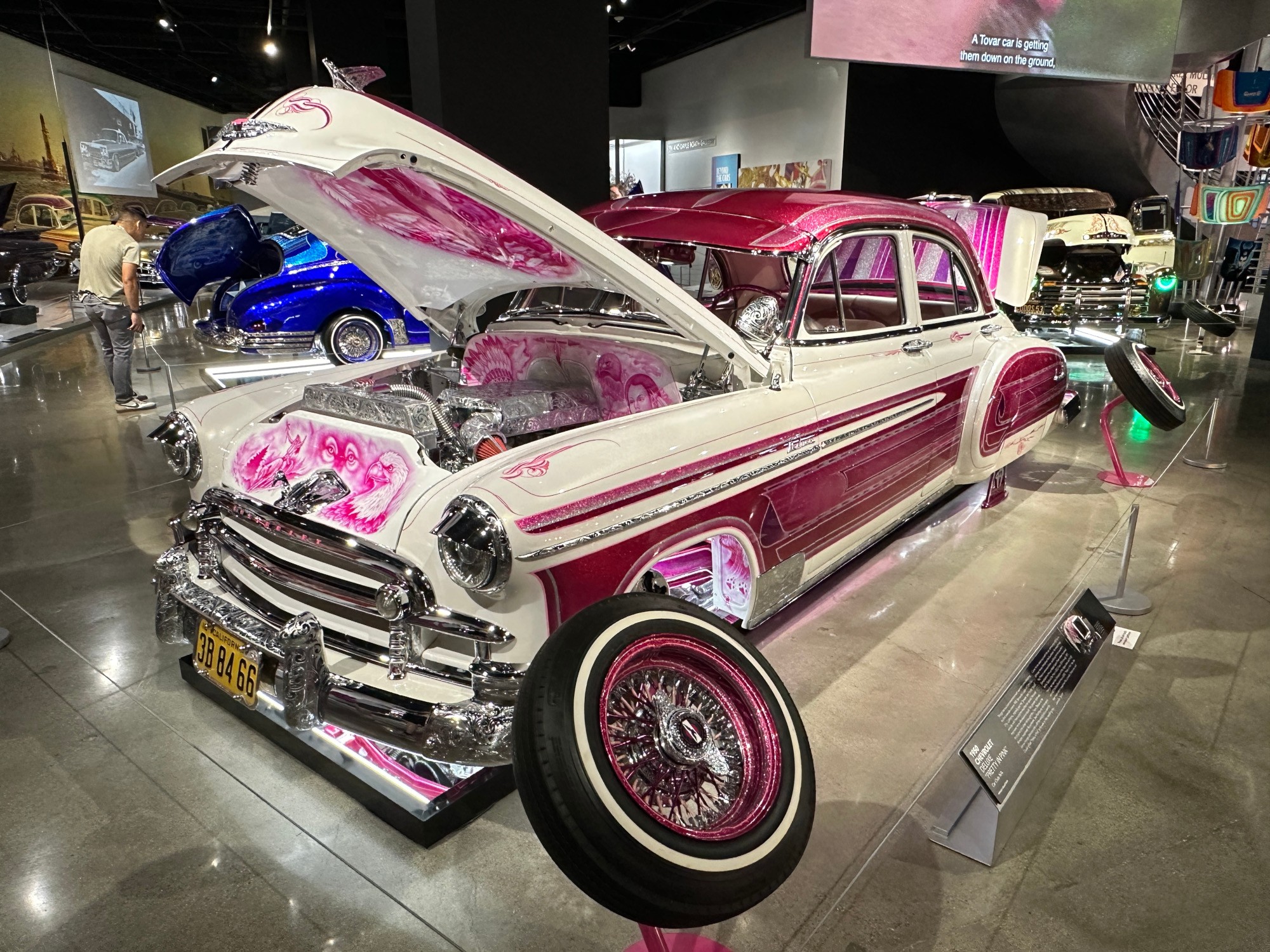Nos, hát Amerika az automobilok és az autózás őshazája, mindenki autóval jár, nem is akármilyennel, ezért nem véletlenül – a fiam javaslatára – egy autómúzeummal kezdtük városnézésünket. Első reakcióként idegenkedtem ettől a látogatástól, hiszen számtalan autómúzeumot láttunk már a világ különböző szegleteiben, többek közt a bukaresti Țiriac Collectiont is, ahol szerencsénk volt Ion Țiriactól autogramot is kérni, és aminek a meglátogatását tiszta szívvel ajánlom mindenkinek, de végül nem bántuk meg, mivel a Petersen autóipari múzeum a világ egyik legnagyobb és legkülönlegesebb gyűjteményének ad otthont. A három szinten megtekinthető kollekció páratlan autóritkaságokat, unikumokat vonultat fel. Híres filmekben szereplő kocsikat is láthattunk, mint például a Vissza a jövőbe című film DeLorean időgépét, illetve Villám McQueen életnagyságú modelljét, de megnézhettük Elvis Presley De Tomaso Pantera, valamint Steve McQueen Jaguar XKSS típusú verdáját is. Számomra a legérdekesebbek az Amerikára jellemző lowriderek voltak, amelyek csillogó-villogó, egyénre szabott hipergiccses festésükkel, rikító színeikkel hívták fel magukra a figyelmet. Elképzeltem, amint a latin, vagy fekete gengszterek éppen csajozni indulnak, és a bivalyerős, hidraulikus felfüggesztéssel rendelkező csodajárgányaikat ugráltatva kikövetelik maguknak a figyelmet és a tiszteletet.