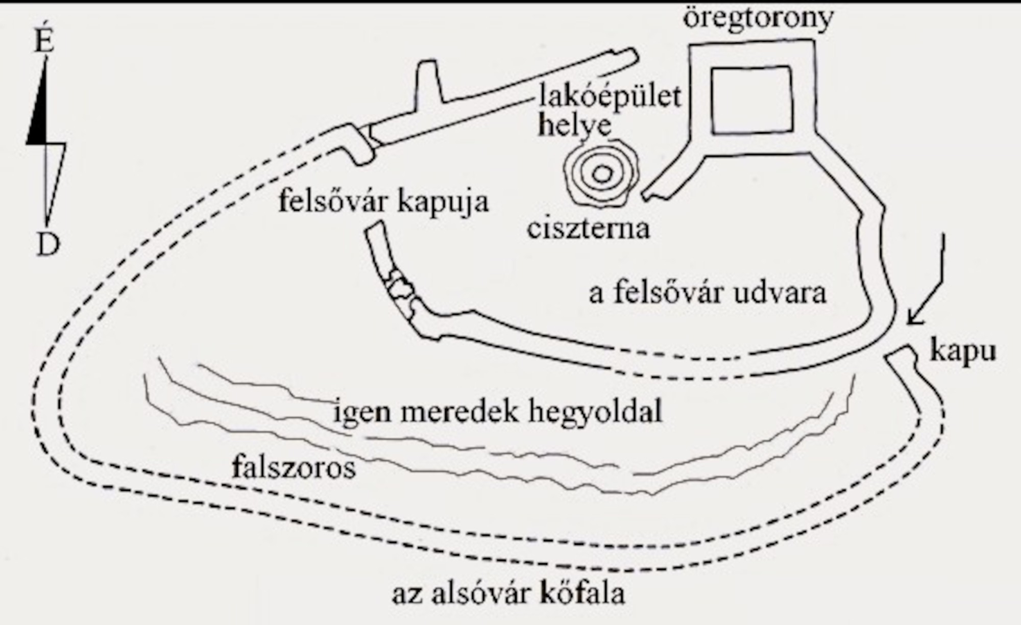 A kelet-nyugati irányban elnyúló, ovális alakú vár alsó és felső részből állt. Az északról vezető út az alsó vár egyetlen, délkeleti kapujához vezet, melyet valószínűleg kaputorony és a sziklába vésett árkon átívelő felvonóhíd erősített.