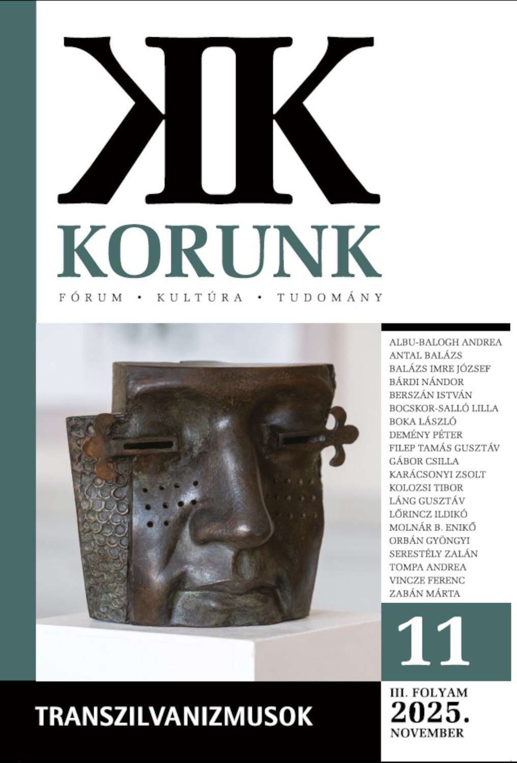 1924-ben indult Kolozsváron az Erdélyi Szépmíves Céh, az erdélyi magyar irodalom reprezentatív könyvkiadója, száz éve kezdett szerveződni az az írócsoport, akiket „helikoni írók” néven ismer az irodalomtörténet. A csoport eszmei hátteréről, a transzilvanizmusról az elmúlt években Boka László szerkesztésében született új kézikönyv, és időről időre újra a politikai érdeklődés homlokterébe is kerül. A Korunk tematikus lapszáma a téma irodalmi, politikatörténeti, színházi, képzőművészeti vonatkozásait vizsgálja, esettanulmányszerűen német és román kulturális kölcsönhatásokkal is foglalkozik. Boka László bevezető tanulmánya a transzilvanizmus történeti változatait és időben változó megközelítéseit foglalja össze átfogó módon. Bárdi Nándor egy Balázs Imre Józseffel folytatott beszélgetésben pontosan dokumentáltan tárgyalja a két világháború közti politikai erdélyiség nagyhatású modelljeit. Antal Balázs a (neo)transzilvanilvanista erdélyi magyar irodalom-vonulat egyfajta alternatívájáról, az erdélyi abszurdról ír, Tompa Andrea pedig amellett érvel tanulmányában, hogy Janovics Jenő kolozsvári színházigazgató számára a Hamlet-szerep nyújtott fogódzókat az új, 1918 utáni kisebbségi helyzet értelmezéséhez. Két további értelmiségi-irodalomtörténészi teljesítményre irányul még kiemelt figyelem a lapszámban: egyrészt Láng Gusztávéra, aki élete utolsó hónapjaiban saját transzilvanizmus-monográfiáján dolgozott. Ennek a könyvnek, amelynek posztumusz megjelenése 2026-ra várható, a Korunk a bevezetőjét közli, Boka László kommentárjával, Balázs Imre József pedig a Láng-életmű Erdély-dimenzióit összegzi. A lapszám másik kiemelt anyaga egy Cs. Gyimesi Éva-kerekasztal írott változata: egykori bölcsészkari kollégái, tanítványai a Gyöngy és homok, illetve az Álom és értelem című, erdélyi tárgyú könyveit olvasták újra. A lapszám további írásainak szerzői: Albu-Balogh Andrea, Bocskor-Salló Lilla, Demény Péter, Filep Tamás Gusztáv, Karácsonyi Zsolt, Keszthelyi György, Lőrincz Ildikó, Vincze Ferenc. A lapszám képanyaga Kolozsi Tibor alkotásainak reprodukcióiból állt össze.