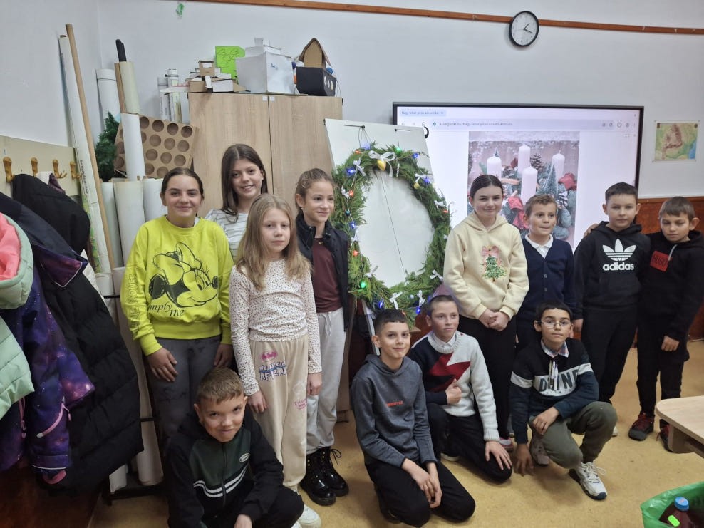 Bodó Tamás zenetanár vezetésével az osztályokban elkészültek az adventi koszorúk, ami az adventi időszak hangulatához tartozik. A gyerekek és pedagógusok ráhangolódnak az év legszebb ünnepére, készülnek a karácsonyi előadásra, amelyre a kultúrotthonban kerül sor, s ahol karácsonyi vásárt is tartanak. A vásári portékákra az iskola biztosítja az alapanyagokat.