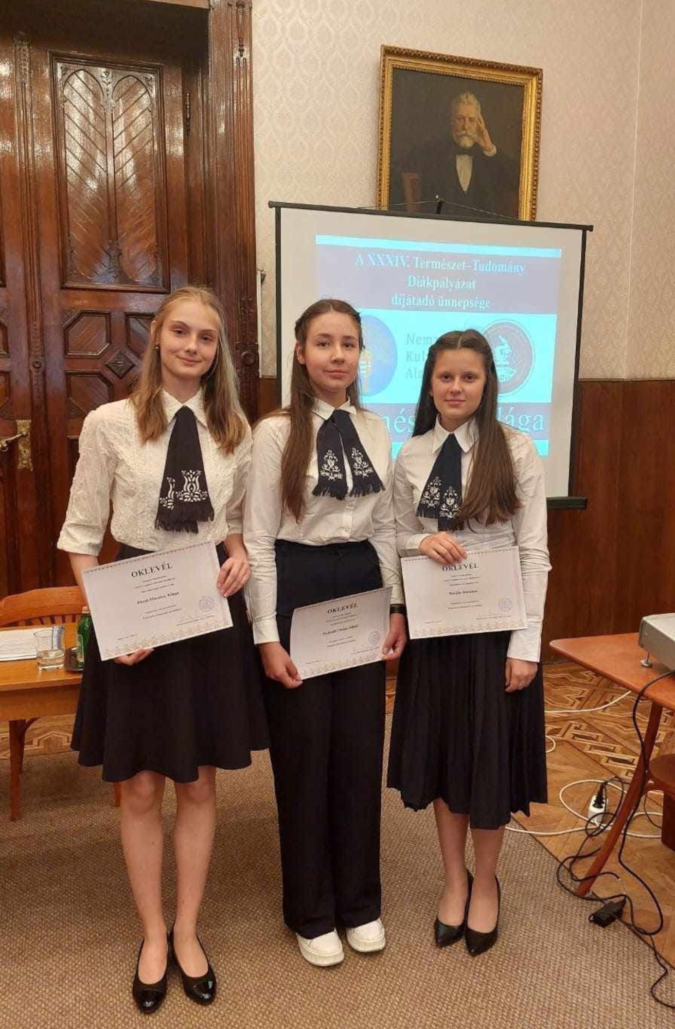 Pávai-Marossy Kinga és Burján Johanna marosvásárhelyi, valamint a nagysármási Porkoláb Csenge-Mikolt (középen), a Bolyai Farkas Elméleti Líceum X. A osztályos tanulói Budapesten átvették a Természet Világa folyóirat diákpályázatának második díját, amellyel lehetőséget nyertek pályamunkájuk közlésére az ismert tudományos folyóiratban. Tudományos cikkük címe: Titokzatos metszetek nyomában, amelyben az iskola szertárában lévő szövettani metszetgyűjtemény történetét és tartalmát dolgozták fel. Igazi kincseket találtak – tudósított József Éva biológiatanárnő.