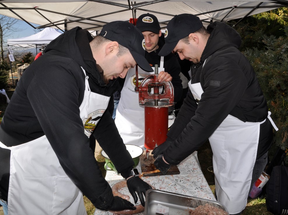 És ez utóbbi esetében a házigazdák igencsak magasra helyezték a mércét, mert az idelátogatókat egy olyan termékbemutató asztal fogadta, amelyen egy szalonnából és kolbászból álló házat is összeállítottak, így Kelementelkén érvényes volt az a mondás, miszerint „kolbászból volt a kerítés” (is). Mi több, kolbászból készített márciuskát is láthattunk.