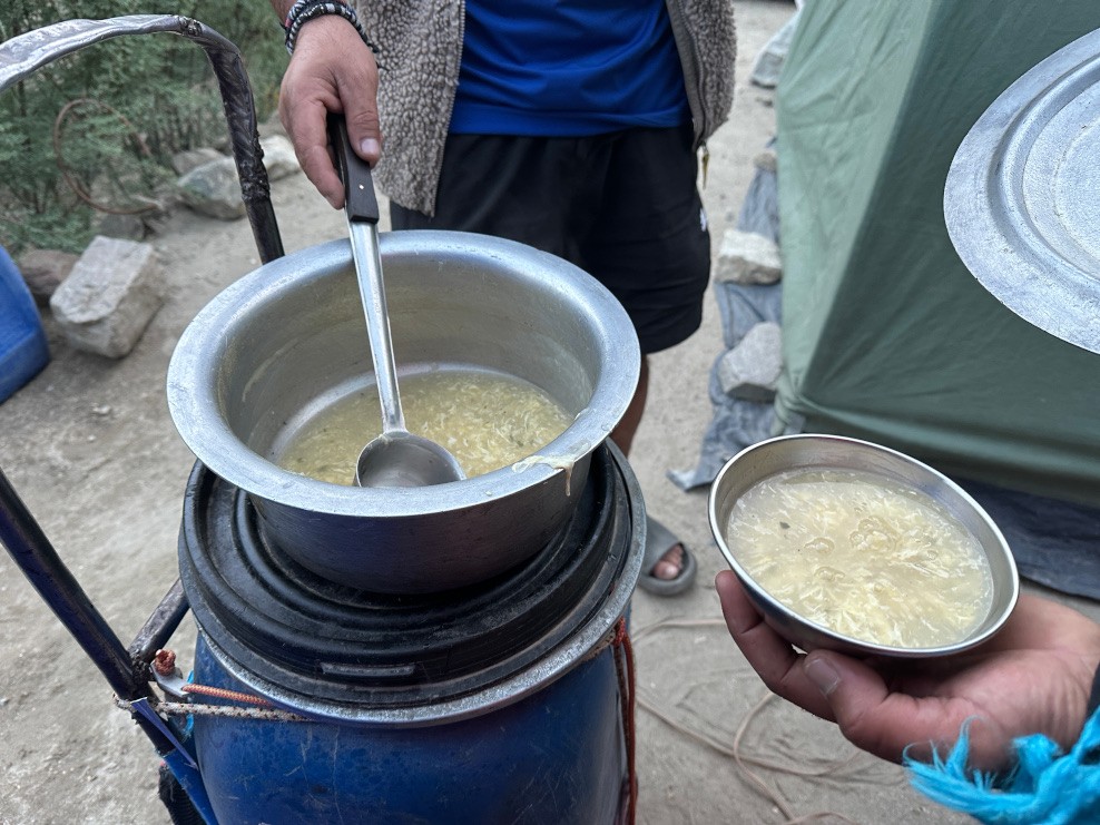 Étkezéseinkről még annyit, hogy a reggeliket mindig a kiindulási kempingben, az ebédeket az útközben rögtönzött táborainkban, a vacsorákat pedig az éjszakázási sátortáborokban fogyasztottuk el. Az étkek kiválóak voltak. Reggelire mindig volt tojás, többnyire omlett vagy keményre főtt változatban, lekvár, mogyorókrém, tea. Ebédre levest, rizst, zöldséges mártásokat készítettek. Levest vacsorakor is mindig tálaltak, de volt csirkehús, rizs, különféle mártások, olykor sült krumpli, gyümölcsök (cseresznye, avokádó, ananász, mangó, maracuja), és persze minden étkezéshez járt a frissen sült lepénykenyér. Az én kedvencem a leves volt, amiből mindig repetáltam (volt, amikor háromszor is), és már csak azért is fogyasztottam nagy előszeretettel, mivel megsózva kiváló hidratáló, elektrolitpótló, testemet, lelkemet melengette, az otthonomra emlékeztetett. Húsra mindennap volt gondjuk, de feltevődhet a kérdés, hogy miként sikerült két hétre elegendő mennyiséget vinni úgy, hogy az ne romoljon meg a nappali hőségben? Erre a világ legtermészetesebb megoldása a válasz: élő állatokat vittünk magunkkal, egytucatnyi tyúkot, valamint egy kecskét, így hát ennél frissebbet kívánni sem lehetett volna. A csirkéket dobozokban vitték az öszvérek, és minden este „kitekerték” egyik nyakát, a kecskét pedig a saját lábán terelgette egyik porterünk mindaddig, amíg egy napon ez a jószág is be nem fejezte földi pályafutását. Az ebédeket nagyjából a napi gyalogút felénél fogyasztottuk el, olyan helyeken, ahol vízlelőhely is volt, amit nyilván nem volt nehéz találni, figyelembe véve, hogy gyaloglásunk gleccserek sztrádáin történt. Az étkezések kiemelt jelentőséggel bírtak, konyhásaink megadták a módját, a „látványkonyha” sürgése-forgása a szemünk előtt zajlott. Nyilván mi magunk és „bukatárjaink” is igyekeztek a körülményekhez képest betartani a higiénét, ennek ellenére a túra során bizony mindenkit utolértek kisebb-nagyobb gyomorrontási epizódok (hogy finoman fejezzem ki magam), de ezek véleményem szerint nem mindig fertőzésekre, inkább a túlevésre, valamint a számunkra nem megszokott fűszerezettségre, a vizek eltérő ionösszetételére, illetve az étkezési olaj túlzott használatára vezethetők vissza. Mindenesetre fel voltunk készülve ilyen sürgősségi helyzetekre, rosszulléteinket igyekeztünk orvosolni, például a Romániában népszerű sárga színű „medicinával”, amely igazi szalvátor lett kicsiny táborunkban.