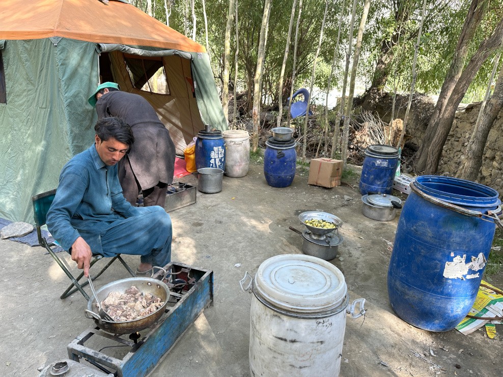 Délben letáboroztunk ebédelni, a szakácsok felverték a lacikonyhát, és azonnal nekiláttak a főzéshez, hogy bennünket frissen főtt, háromfogásos ebéddel kényeztessenek. A konyhamesterek első dolga az volt, hogy a folyóba torkolló patakokból vizet merítsenek, amely ebben az esetben nevezetesen a Biafo-gleccser olvadékvizét jelentette. Ezt használták főzéshez, ebből lehetett levest, teát, kávét készíteni, és a kihűlt változatát szomjoltó ivóvízként kortyolgattuk.