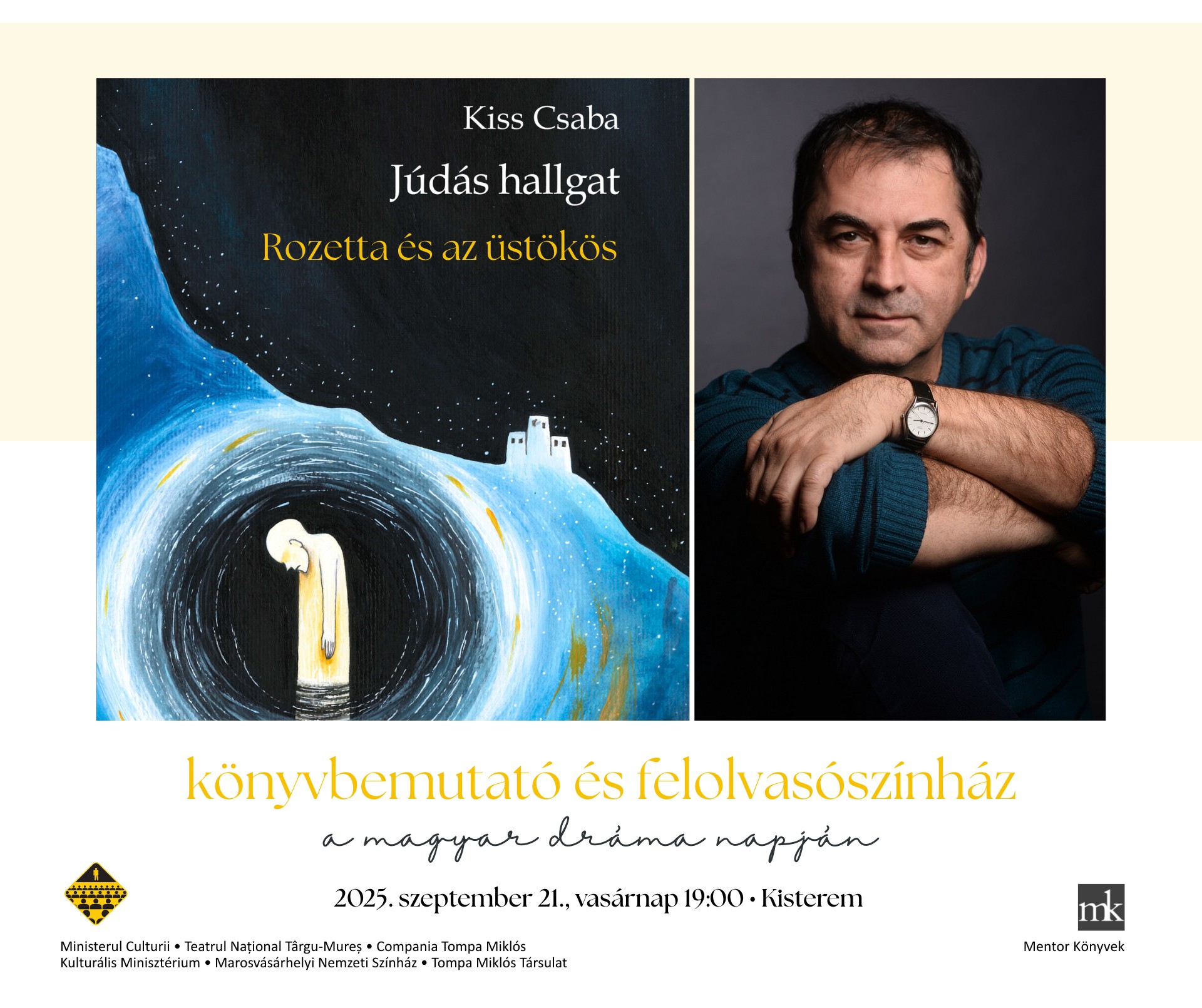 Könyvbemutató (Júdás hallgat) és felolvasószínház (Rozetta és az üstökös) a magyar dráma napján: szeptember 21-én este 7 órától a Marosvásárhelyi Nemzeti Színház Kistermében.