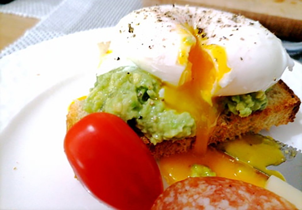 Egy érett avokádót villával összetörünk kevés lime-lével, mokkáskanálnyi vajjal, 1 cikk zúzott fokhagymával, sóval, darált borssal. A kenyeret megpirítjuk, majd rákenjük az avokádókrémet. Kis fazékban vizet forralunk, kevés ecetet töltünk bele, és pici sót adunk hozzá. A tojásokat beleütjük, és kb. 2 percig főzzük. Szűrőkanállal kiemeljük őket, és az avokádókrémre helyezzük. Közepén bevágjuk, és máris élvezhetjük a csorgó tojássárgát. Fűszerezhetjük kakukkfűvel, darált borssal, szárított chilis mentával.