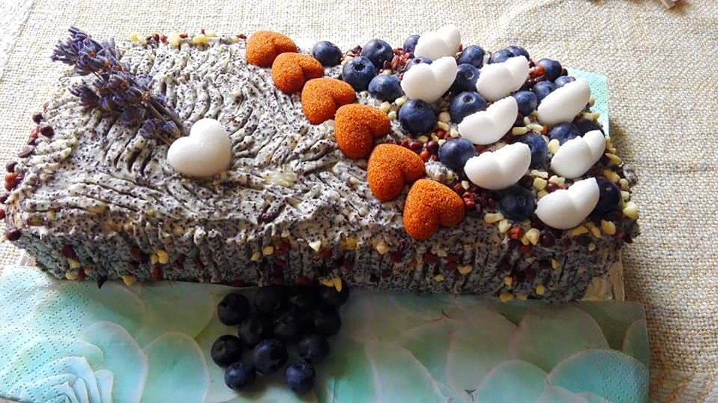 Öttojásos piskótát készítünk a következő alapanyagokból: 5 tojás, 5 kanál cukor, 3 kanál víz, csipet só, reszelt citromhéj, fél tasak sütőpor, 8 kanál liszt. A tojásfehérjét külön kemény habbá verjük, és úgy keverjük óvatosan a masszához. A megsült piskótát kihűtjük, hosszában elvágjuk, majd mindkét fél piskótát kettőbe vágjuk. Meglocsoljuk vaníliás cukros vízzel. Krém: 35 dkg 82%-os zsírtartalmú vaj, 25 dkg porcukor, 25 dkg mascarpone, 1 evőkanál rumesszencia, 25 dkg darált mák, kevés citromhéj. Botmixerrel kidolgozzuk a krémet, megtöltjük vele a lapokat, majd kívülről is bevonjuk. Tetszés szerint díszítjük.