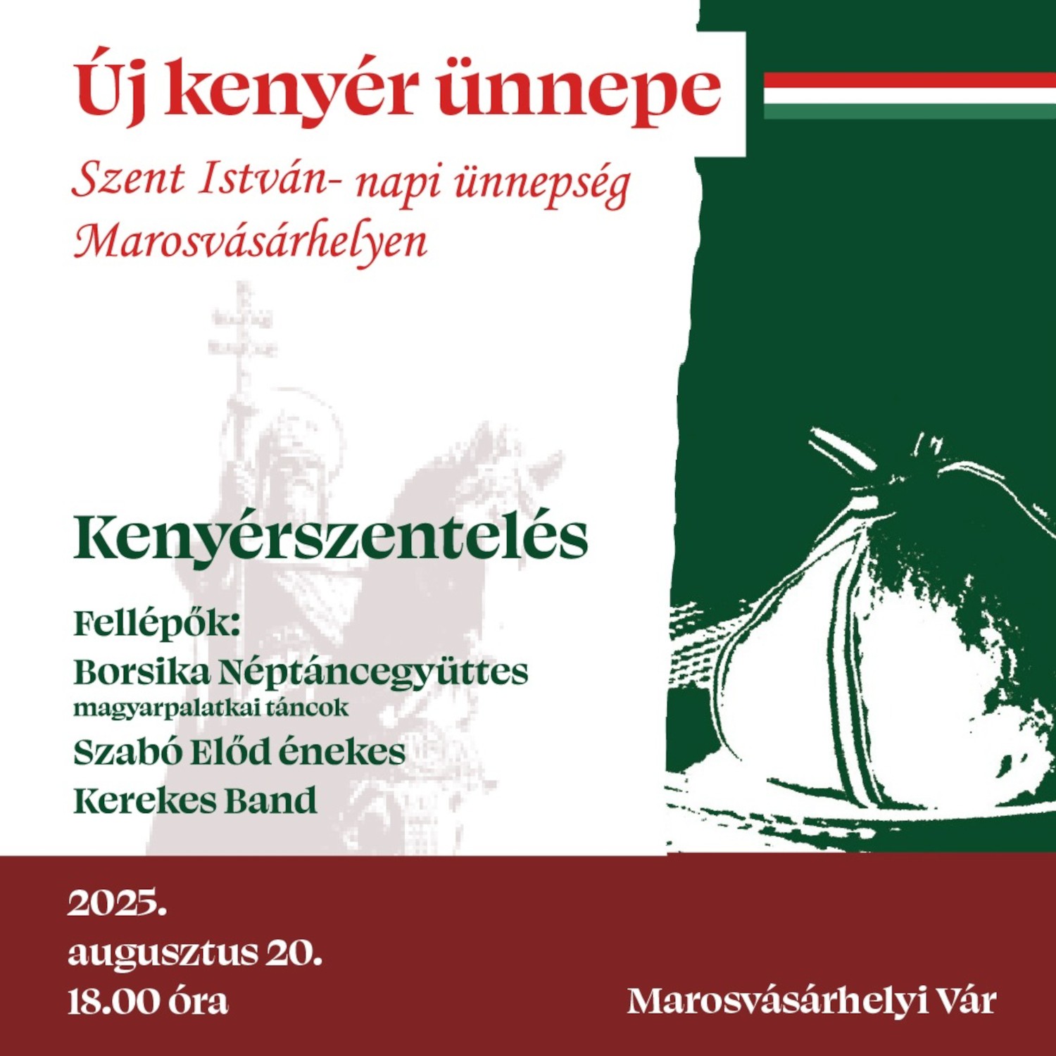 A Szent István-napi ünnepség augusztus 20-án 18 órától a marosvásárhelyi várban kezdődik. Fellép a Borsika néptáncegyüttes, amely magyarpalatkai táncokat mutat be, Szabó Előd énekes, valamint a történelmi egyházak képviselőinek kenyérszentelésére is sor kerül.
