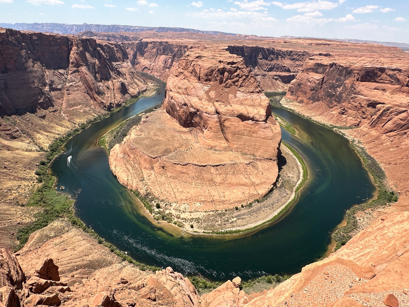Az egyik ilyen csoda a Colorado folyón található Patkó-kanyar (Horseshoe Bend). Nem kell magas szintű intelligencia ahhoz, hogy a névből következtetni lehessen a látnivaló jellegére, és mégis…, amikor félóra séta után letekintettünk a 300 méterrel alattunk elterülő Ω betűre, egyszerűen leesett az állunk, mozdulni sem tudtunk. Nem kerestük a szavakat, erre túl kevés a „gyönyörű”, csak néztük némán, miként hurkolja át a folyó az oltári sziklát. Értelmünkkel felfogtuk a pergő mulandóságot, szívünkkel mégis az örökkévalóságba kapaszkodtunk. A smaragdzöld folyó könnycseppként verődött vissza a szemekben, a mesterséges intelligenciával bíró telefon is csak széles látószögű üzemmódban tudta befogni e geológiai csodát. Ilyesforma meanderrel lehet még találkozni a Coloradó mentén, hasonló élmény volt a Dead Horse Point park területén látott folyókanyarulat is.