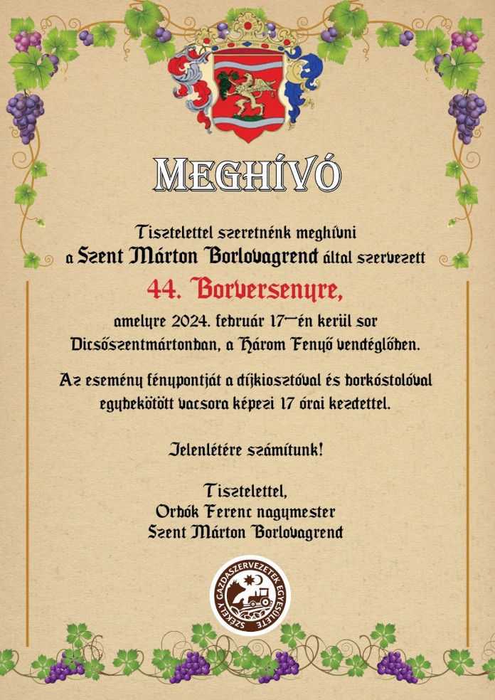 A Szent Márton Borlovagrend nagymestere, Orbók Ferenc elmondta, tavaly, a 43. alkalommal megtartott borversenyre 245 bormintával neveztek be, ez a szám évente hozzávetőleg azonos. Az idei versenyre a bormintákat február 12., 13., 14-én 14–16 óra között kell eljuttatni a borlovagrendnek a dicsőszentmártoni múzeum alatti székhelyére, falvakon pedig a megszokott helyekre. A díjkiosztással, borkóstolóval egybekötött vacsora február 17-én, szombaton 17 órától kezdődik. A jó hangulatot a szászcsávási cigányzenekar biztosítja. A részvételi szándékot február 16-án 14 óráig lehet jelezni Czirmai Leventénél, a 0740-026-395-ös telefonszámon.