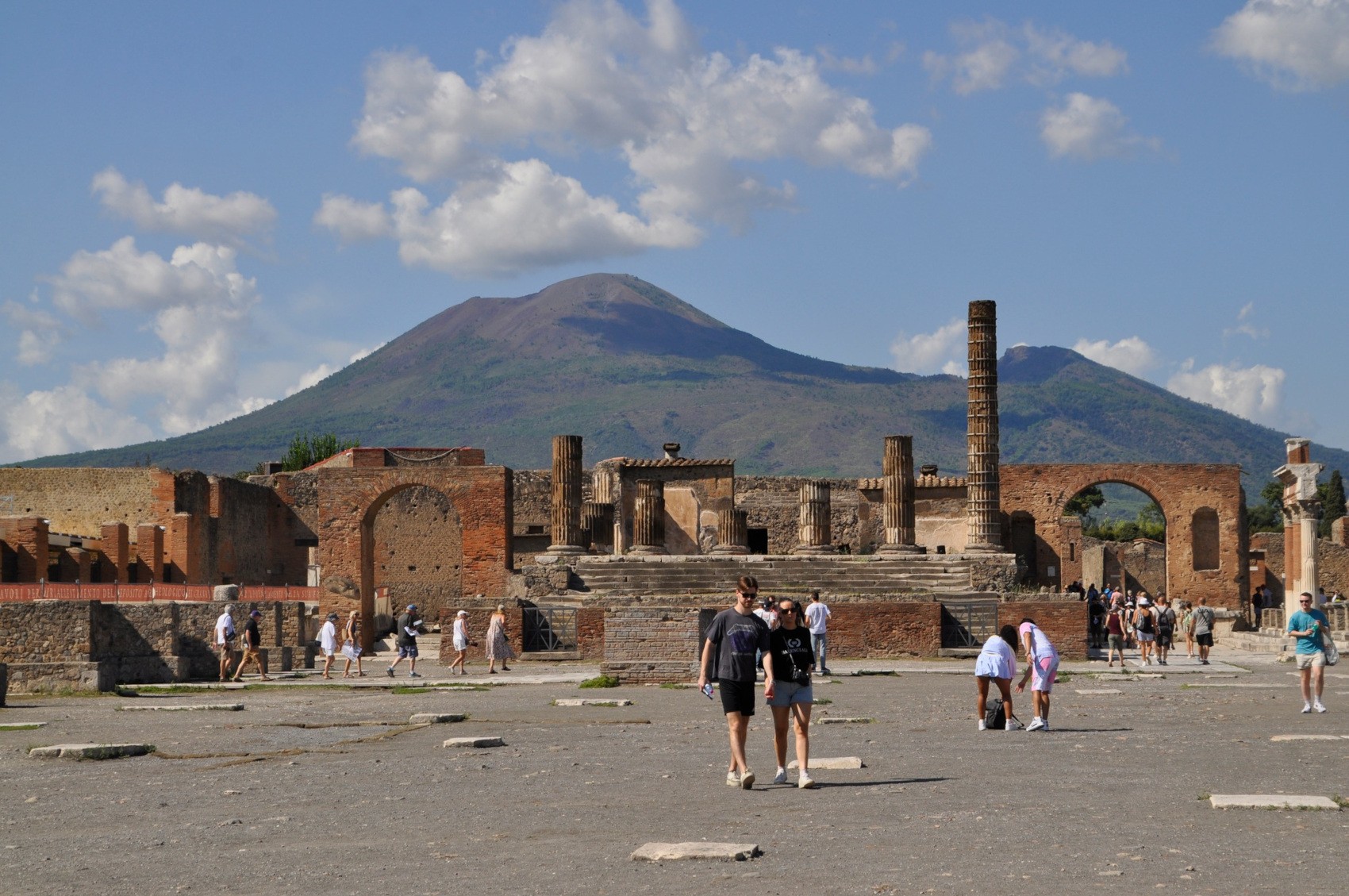 Aztán ott a fórum, ami fölött ezúttal békésen trónol a Vezúv. Romjaiban is szép Vespasianus, Jupiter, Augustus, Fortuna, Isis templomaival, Tiberius diadalívével. Egykor fehér márványlap borította, oszlopcsarnokának falai színesek voltak, és több szobor is díszítette. Ide nem volt szabad behajtani szekerekkel, és ezt úgy oldották meg, hogy a mai napig is látható nagyobb kőtömbbel zárták el (pont a keréknyomok irányában) a kerekes járművek útját. Innen nyílt a piactér is, ahol az egykori árusok által elfoglalt fal menti beugróban a város területén talált amforák, tárolóedények egy részét raktározzák. Itt láthatók azok a gipszminták is, amelyek megőrizték három egykori lakos testalakját. Egyik idegenvezető mondta, hogy a lávával takart város felett lóval közlekedtek, és a patadobogás különleges hangjára figyeltek fel, amely üreget jelzett. Mivel tudták, hogy csakis valamilyen régészeti leletről van szó, óvatosan bontották ki a vulkanikus réteget, és a formára felfigyelve öntötték ki gipsztejjel az üreget, így készítve el az első lenyomatot. Érdemes közelebbről is megtekinteni az üveg alá helyezett emberimaradvány-lenyomatot, mivel kivehető a cipő formája, szeges talpa, döbbenetes így szembenézni egy 2000 évvel ezelőtt élt egykori pompeji lakossal. A piactéren még találtak csontvázakat. Valószínűleg árusok lehettek, akik portékájukat kínálták, amikor elérte őket a gyilkos vulkáni hamu.