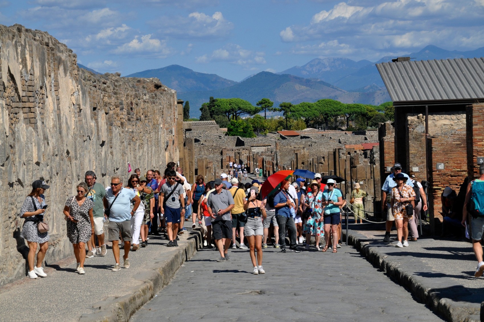 A helység nemzetközi hírneve ellenére az állomás épülete és a környéke olyan, mint egy lepukkant romániai vasúti megálló. Itt is nyájként megyünk a régészeti park bejáratához, mert nem látunk irányjelzőket. Közben buszok, gépkocsik és kirakóvásár között araszolunk, míg végül megtaláljuk a főbejáratot és a jegypénztárt. Ingyentérkép jár, lehet audiokészüléket bérelni idegenvezetésért (ami egy mobiltelefon), és akár egy személy mellé is felfogadható legtöbb esetben angol és olasz nyelvű idegenvezető. (Annak írom, aki még nem volt Pompejiben.) Az egész napos nyitvatartási idő alatt lehetetlen alaposabban bejárni az egész várost. Ezért érdemes előre kiválasztani azt a részt, amely különösebben érdekel, és ajánlott az időutazás során néha rápillantani az órára, mert a jelenben mért idő (óra) igen hamar telik. A várost negyedekre osztották fel, ezeket külön jelölik a térképen is, így érdemes belépés előtt átnézni az eligazítót, mert akkor az érdeklődésnek megfelelően könnyebben beosztható az idő.