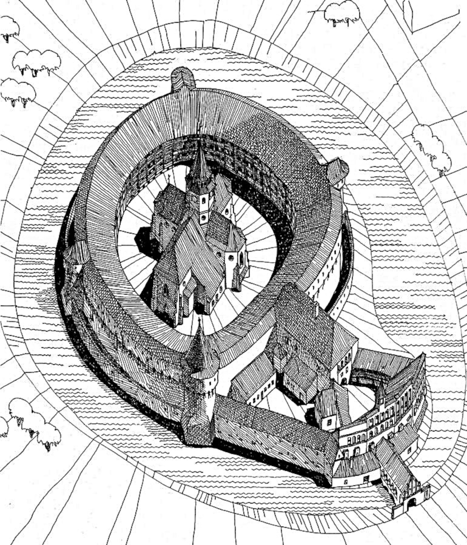 A templom köré hármas védőfalrendszert építettek. A külső védőfal a várost vette körül, a toronyból szétnézve még ma is felismerhetők az egykori város határai, ahol a telkek és a házak is kisebbek voltak.