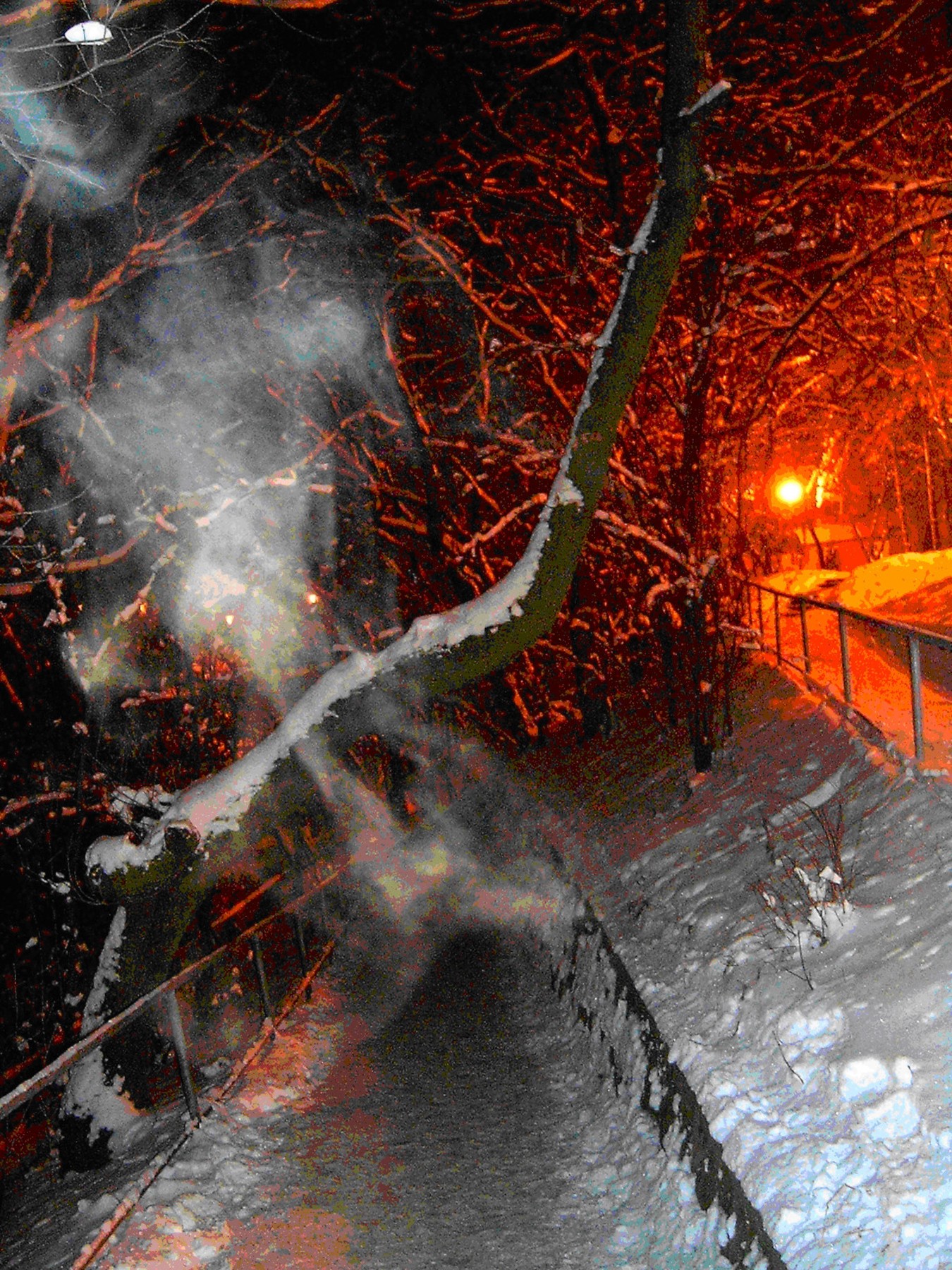 A hó sűrű hálót sző a sarki lámpa fényglóriája köré. Aztán a fény szinte belevész a vízesésszerű havazásba. Nem, nem kavarognak, szinte zuhannak lefelé számolhatatlanul a pelyhek. Nem pihék ezek, nem is pelyhek, szinte tollak – zuhataga.