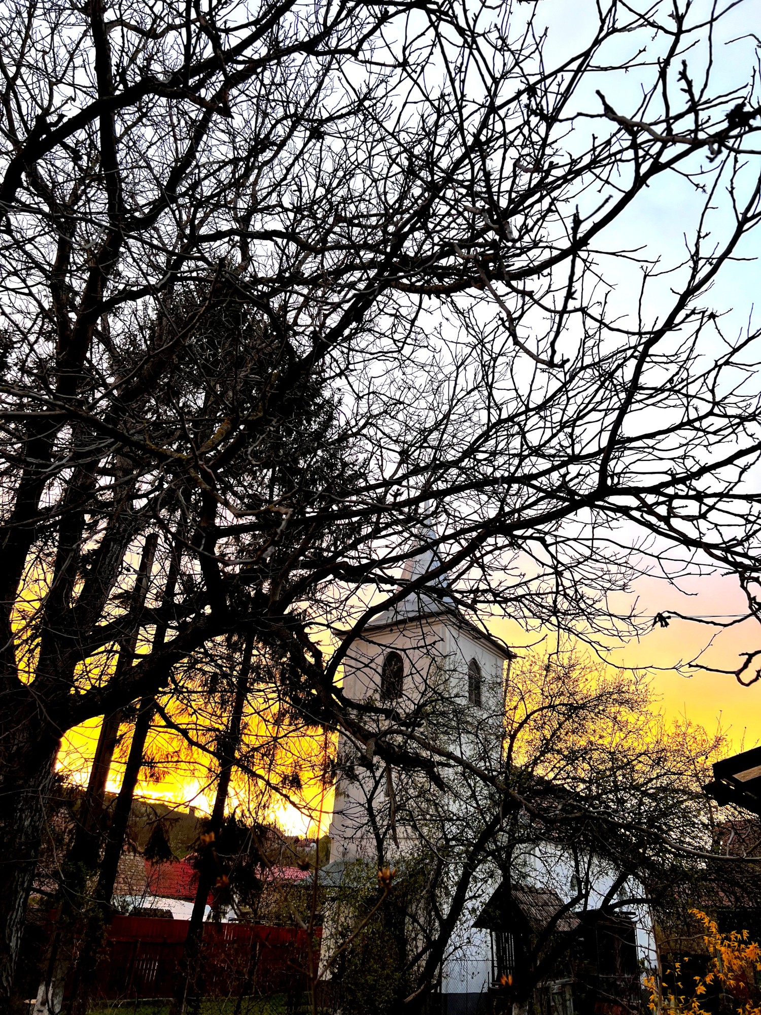 A gólyapár visszavette fészkét az omladozó abosfalvi Apor-kastély előtti villanyoszlopon. Kelepelésükre rácsodálkoztak az út túloldalán a kis református templomba búcsúztatóra érkezők. Alaposan eláztatta őket a hirtelen érkező jeges eső. A napnyugta már aranyba vonta a szeszélyesen kitisztuló ég alját a hófehér templomtorony mögött. Az elárvult virágoskert tulipánjai emlékeket bájolnak.