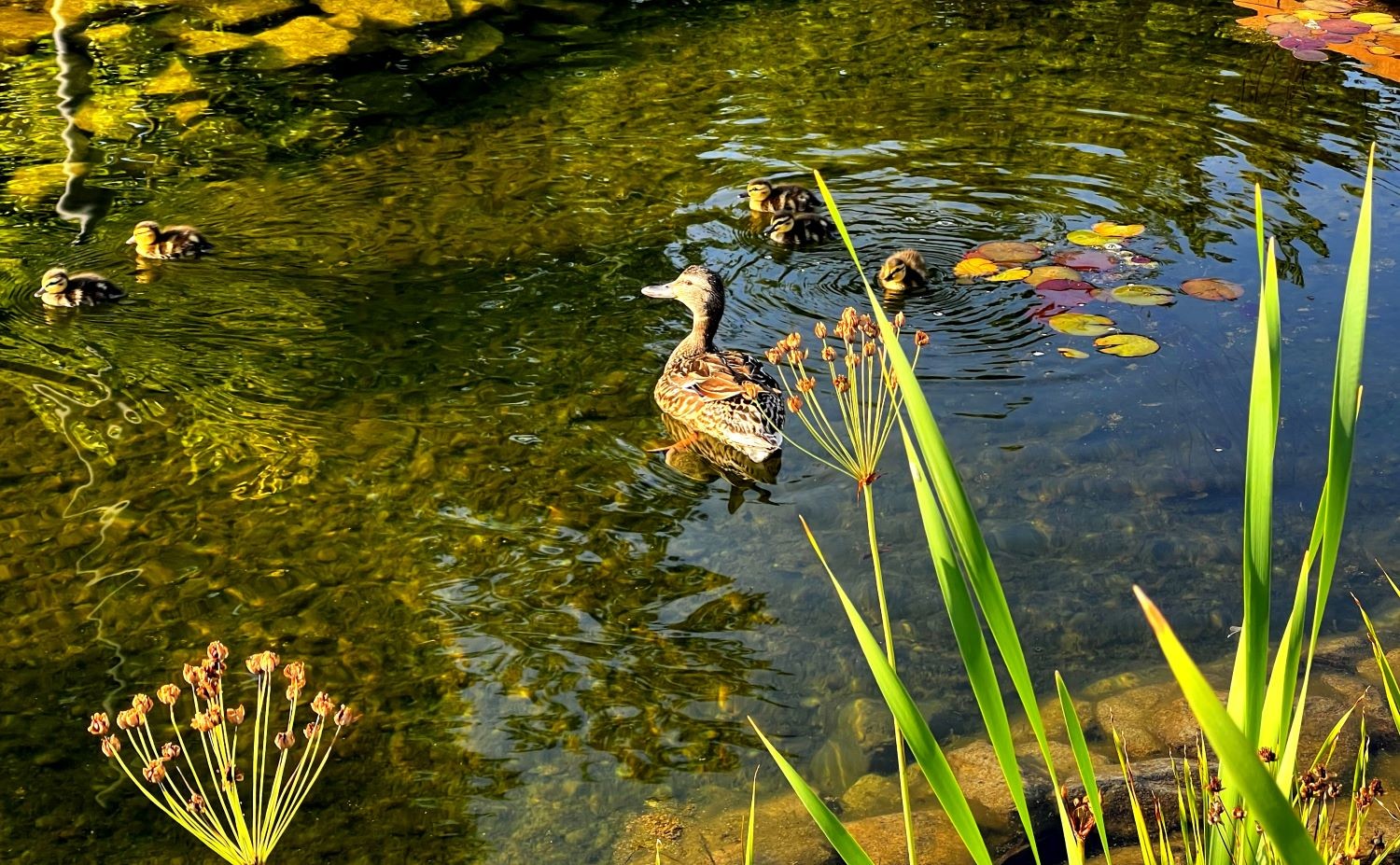 Tőkésréce tojó pipéivel reggeli fényözönben