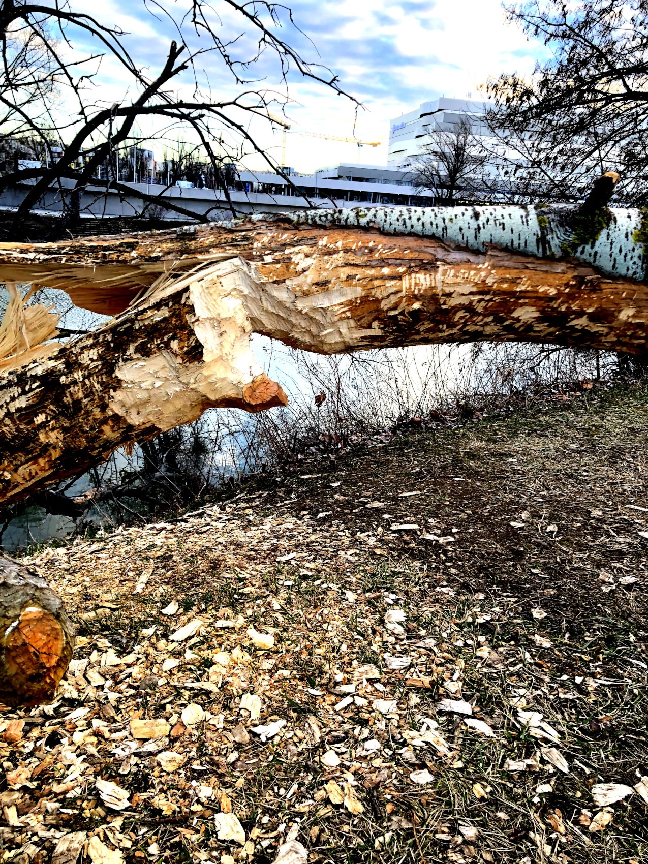 2024 márciusa – hódrágta döntött nyárfa, a háttérben