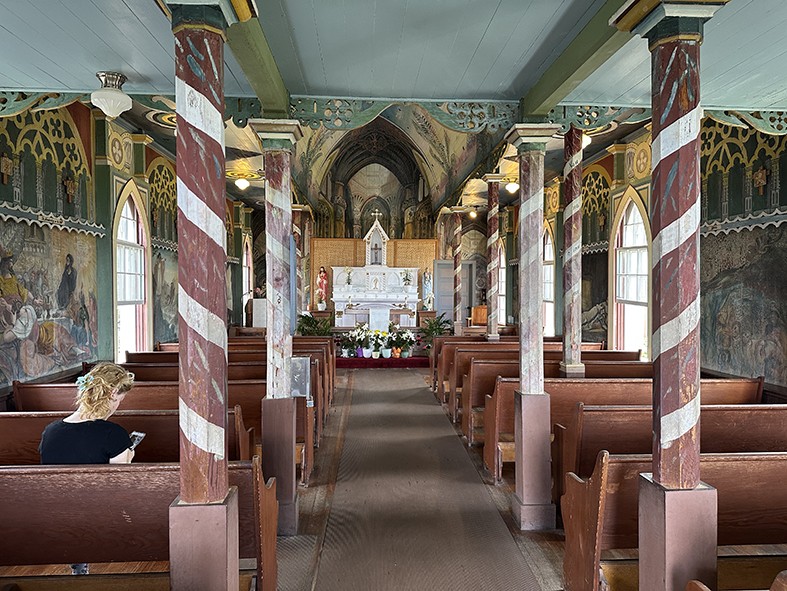 A nyugati parton folytatva felfedezéseinket, egy táblát láttunk, amelyen a „painted church” azaz a festett templom felirat állt. Kigyúlt a lámpa a fejemben, hiszen gondolatban máris Bukovina és Máramaros világhírű templomai jelentek meg, ezért elhatároztuk, hogy ezt a festett templomot nem hagyjuk ki. A jelzéseket követve egy bájos kis templomocskára bukkantunk, amelyet még az útleíró könyvünk sem említett. A hófehér külsejű Szent Benedek-templom kívülről is tetszetős volt, fából készült gótikus jegyeket viselő ékszerdobozra emlékeztetett. A templombelsőbe lépve ámultunk a bibliai jeleneteket ábrázoló festményeken, és Csilla segítségével igyekeztünk felidézni a történeteket. Az úrházát építtető atya autodidakta művészként készítette a freskókat, azzal a szándékkal, hogy sikeresebben taníthassa az akkoriban többnyire írástudatlan helyieket. A buja növényzetű parkban megbúvó templom mennyezetére olyan csillagok voltak pingálva, mint a segesvári református templomban, a páfránylevelek pedig úgy voltak felfestve, mintha azok a tartóoszlopokból nőttek volna ki. Külön egzotikumok voltak a temető sírjainak lávakő domborulatai, de mi mást is várhatnánk el a sziget egyik híres vulkánjának, a napjainkban is bármikor aktívvá váló, 4170 m-es Mauna Loának a lejtőjén?