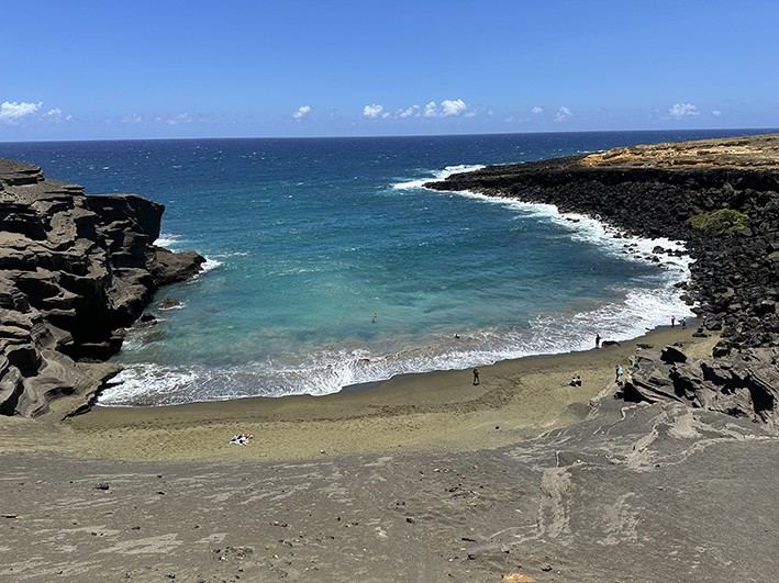 A déli fokot megkerülve, a sziget további érdekességeit faltuk. Utazásunk előtt sokat olvastam a sziget egyik különös strandjáról, ahol a homok egyedülállóan zöldes árnyalatú. Azt is tudtuk, hogy ez a partszakasz nagyon eldugott, nem vezet oda út, és vagy be kell vállalni az oda-vissza félnapos gyalogtúrát a tűző napsütésben, vagy be kell fizetni a feketén (micsoda, még Amerikában is van ilyen?) működő helyi srácoknak, akik a rozoga papucs-Dacia alakú, elnyűhetetlen járgányaikkal elvisznek és visszahoznak. Idő hiányában ez utóbbit választottuk, de ne higgye a kedves olvasó, hogy ez könnyű volt. A néhány kilométerre fekvő partszakaszt az autó rakodóterének vasszegélyén dülöngélve tettük meg. Összevissza imbolyogva a jókora homokdűnéken, kékek-zöldek lettünk, mire megérkeztünk a magas sziklákkal szegélyezett aprócska öbölhöz. A Papakōlea Beach vagy Zöld homokos strand (Green Sand Beach) néven emlegetett tengerpart homokjának a színárnyalata az éretlen olajbogyóra emlékeztet, a homok vasban és magnéziumban gazdag olivinkristályokat tartalmaz. A strandot a világ minden részéből felkeresik, s most már mi is elmondhattuk, hogy megfürödtünk egy olyan ritka homokkal rendelkező strandon, amilyenhez fogható mindössze négy található széles e világon.