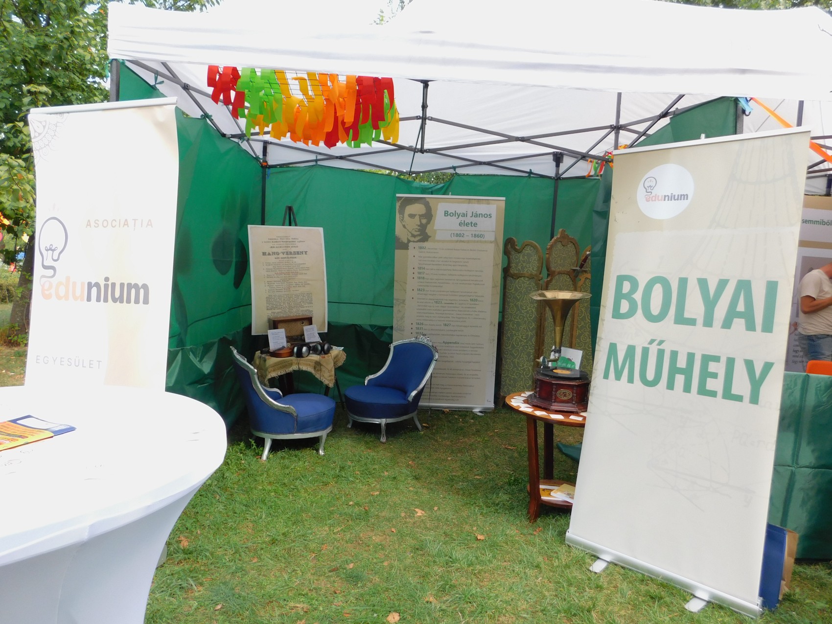A kiállítás, amelynek elkészítéséhez a Teleki Téka, a Bolyai Collegium Alapítvány és a Bolyai Farkas Elméleti Líceum is hozzájárult, eddig statikus anyagokból állt, de sikerült mobilissá tenni, így vehetett részt a Vásárhelyi Forgatagon. Az EDUnium egyesület szeretné iskolákban és mindenütt népszerűsíteni, ahova meghívást kapnak. – Nagy öröm számunkra, hogy fiatal önkéntesek segítségével sikerült kivitelezni az interaktív kiállítást, és ők segítenek a látogatók végigvezetésében is – tájékoztatott Zayzon Zsuzsánna, az EDUnium egyesület vezetője.