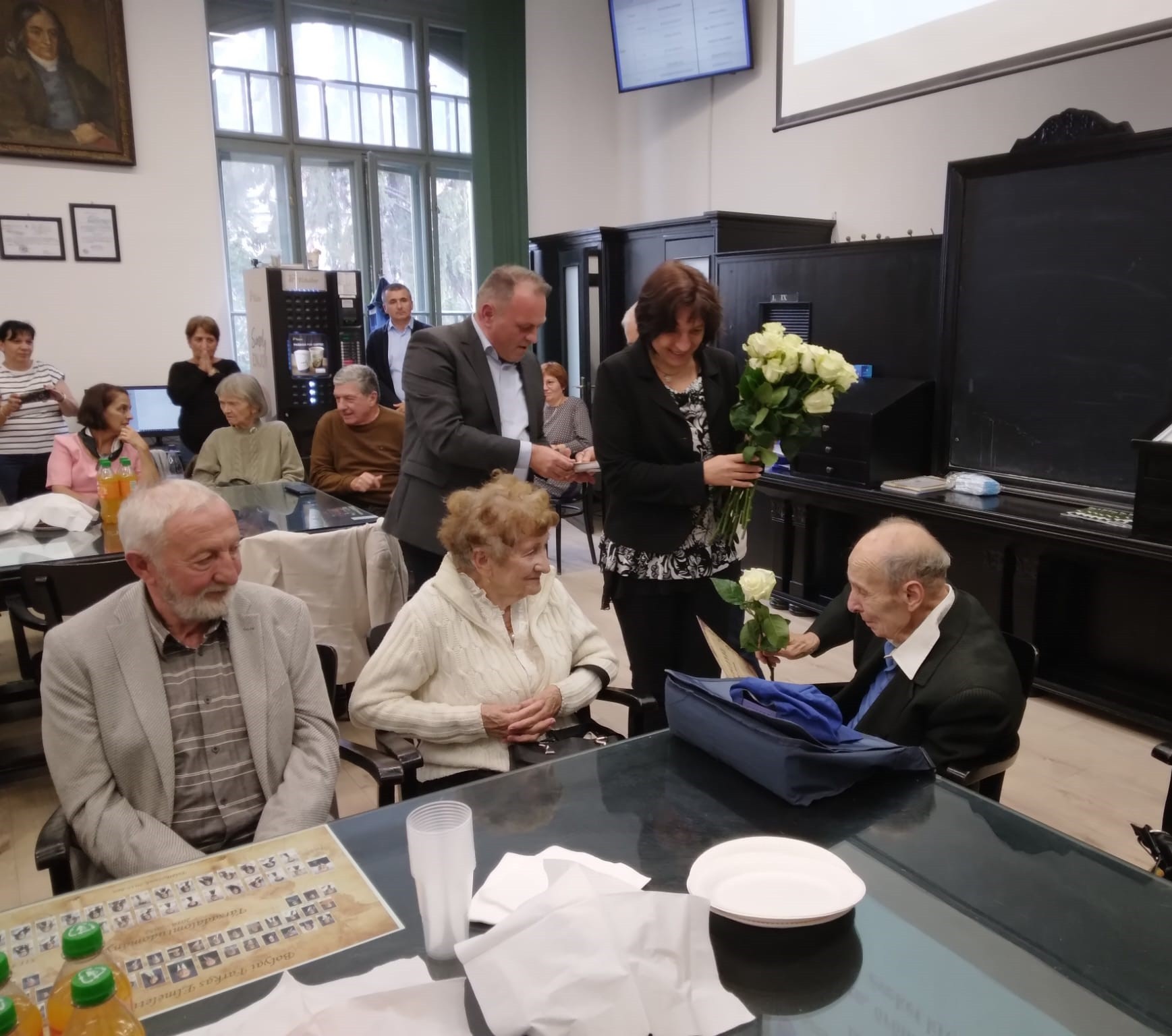 Az iskola vezetősége minden jelen levő volt kollégának díszoklevelet és egy szál rózsát nyújtott át.