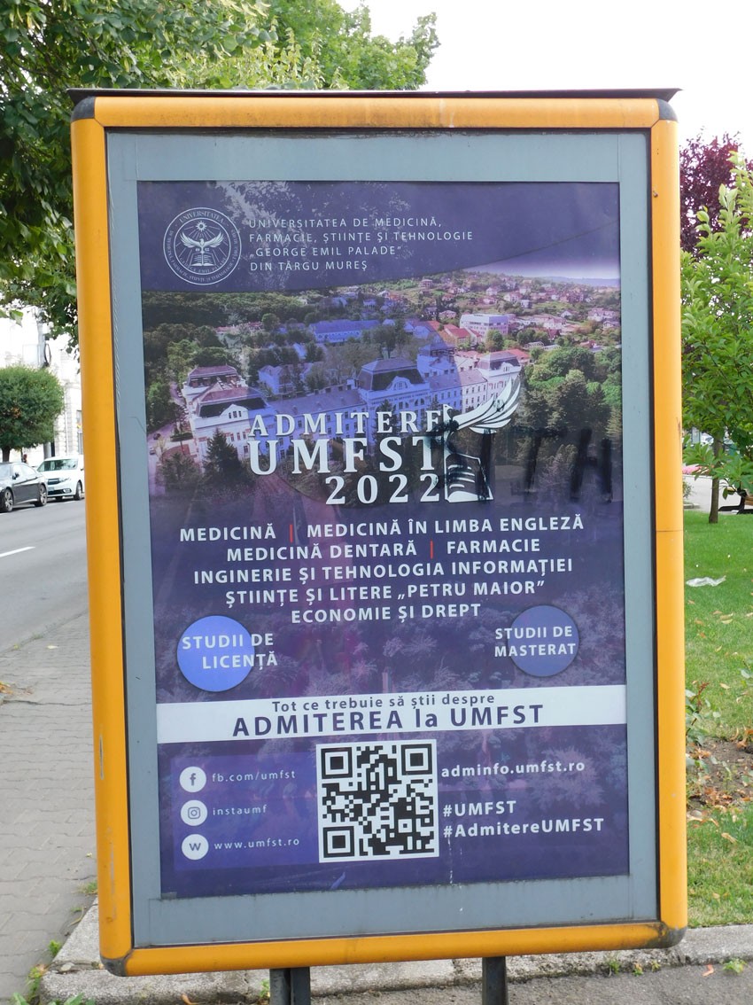 Több ismerősöm rám kérdezett, hogy indul-e egyáltalán magyar oktatás a George Emil Palade Orvosi, Gyógyszerészeti, Tudomány- és Technológiai Egyetemen. Az elektronikus ismertetőben apró betűkkel azt írja, hogy igen, de az egyetem által a főtéri park szélére kihelyezett nagy hirdetőtáblákon, amelyek csak román nyelvűek, és amelyeken az angol nyelvű orvosi oktatás önálló karként szerepel, a magyarnak nyoma sincsen.