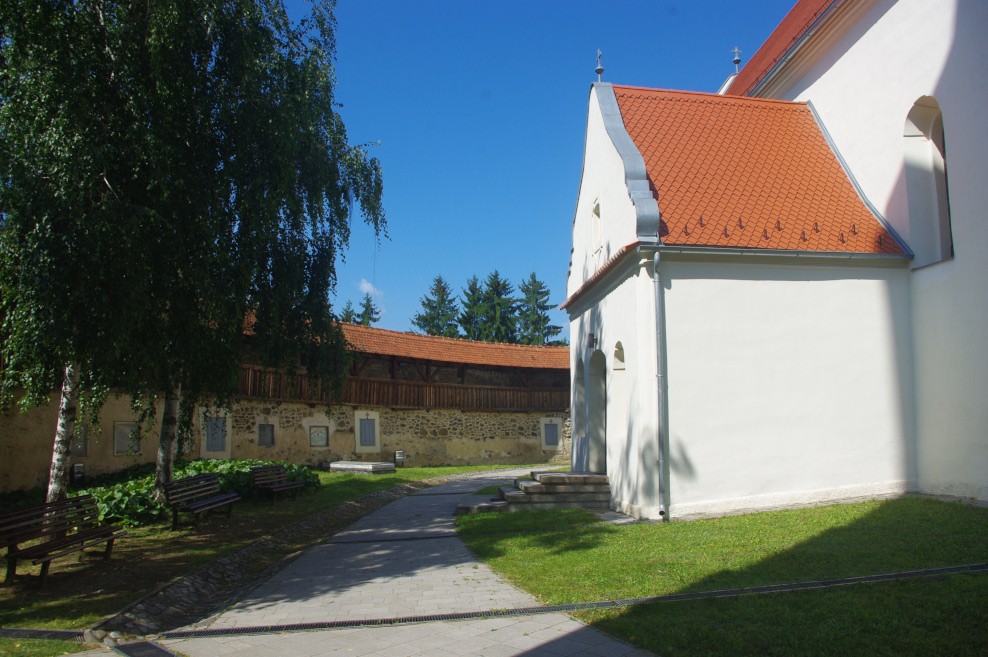 A gyilokjáró tetőszerkezete, valamint udvar felőli tornácos mellvédje újabb keletű. A védőfolyosó udvari falára fémre festett stációképeket helyeztek el a 18. század végén.