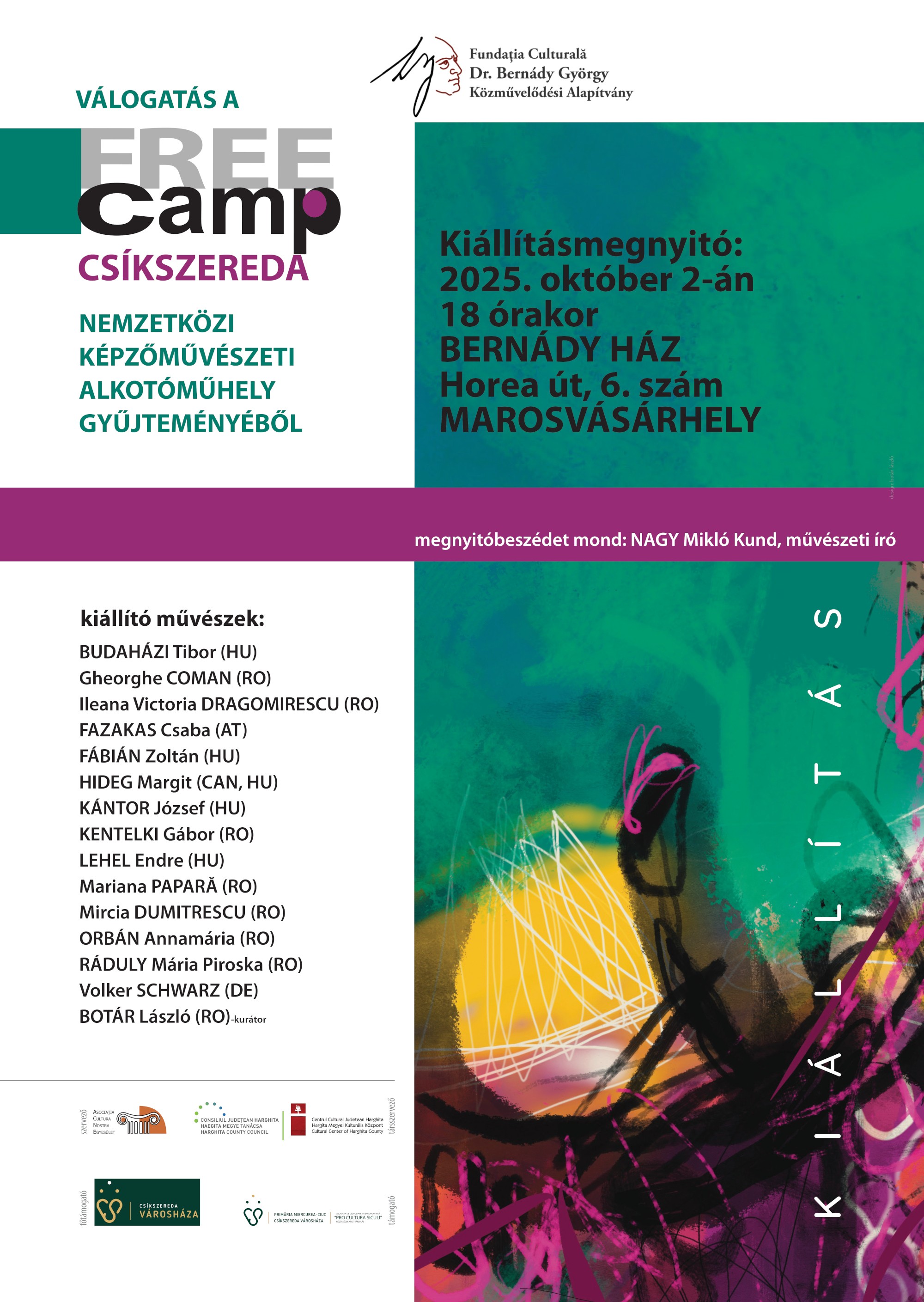 A FREE Camp Nemzetközi Képzőművészeti Alkotótábor a Cultura Nostra Egyesület által szervezett projekt, amelyben a Hargita Megyei Kulturális Központ és Hargita Megye Tanácsa is részt vesz társszervezőként, a Csíkszeredai Városháza hathatós támogatásával.