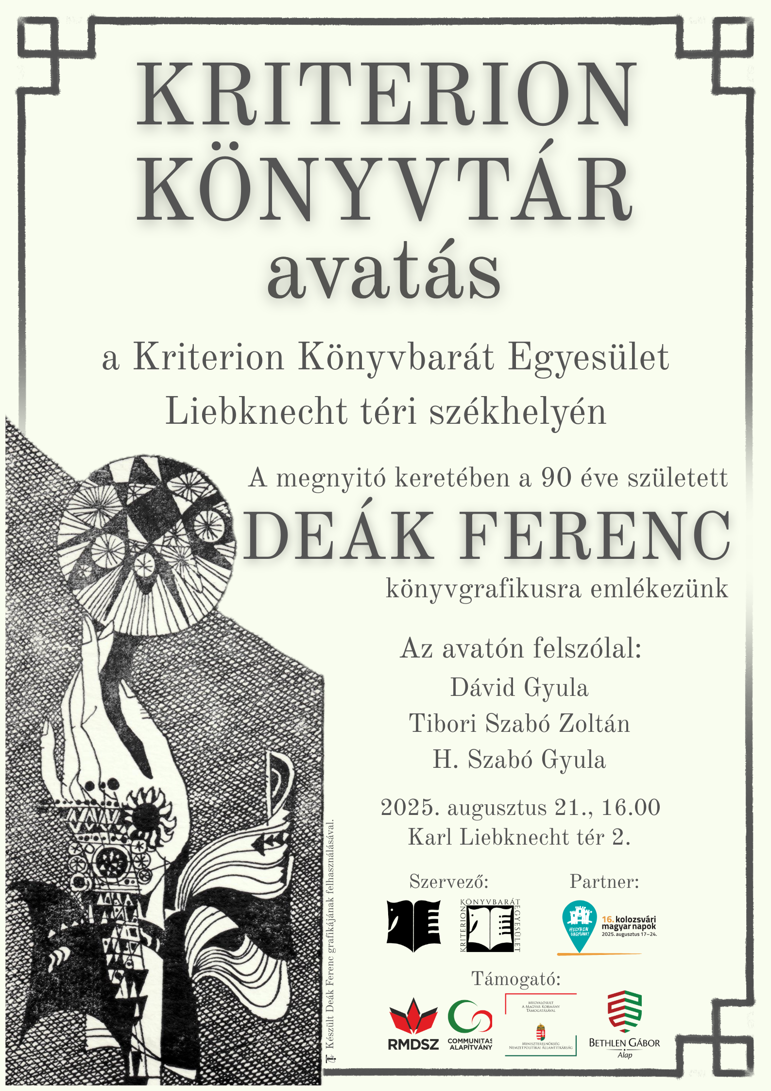 Megnyitották a Kriterion Könyvkiadó könyvtárát Kolozsváron, ezzel negyedszázada dédelgetett álom valósult meg, azonban a leltározás és a különböző munkálatok korántsem értek véget. A gyűjteményt a kiadó székhelyéről, Bukarestből, a Scânteia-házból szállították az Irisztelepi Écriture-Sajtóházba. H. Szabó Gyula és munkatársai abban bíznak, megszólíthatják a fiatalokat, és bevezethetik őket a könyvkiadás világába, ezzel is közelebb hozva számukra az irodalomművelést és a könyves kultúra ápolását. A megnyitón tárlatot is bemutattak, amely a Kriterion egykori jeles művészeti szerkesztőjének, arculattervezőjének, az ikonikus lovacska logó megalkotójának, Deák Ferencnek állít emléket, aki idén lenne kilencven esztendős. A kiállításon a Deák tervezte könyvborítókat és egyéb, a kiadóhoz kötődő grafikai anyagokat lehet megnézni. A rendezvény a 16. Kolozsvári Magyar Napok részeként valósult meg.
